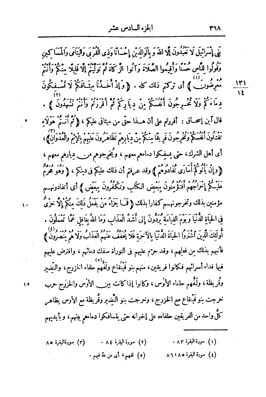 «1» أى تركتم ذلك كله. (وَإِذْ أَخَذْنا مِيثاقَكُمْ لا تَسْفِكُونَ دِماءَكُمْ وَلا تُخْرِجُونَ أَنْفُسَكُمْ مِنْ دِيارِكُمْ ثُمَّ أَقْرَرْتُمْ وَأَنْتُمْ تَشْهَدُونَ)