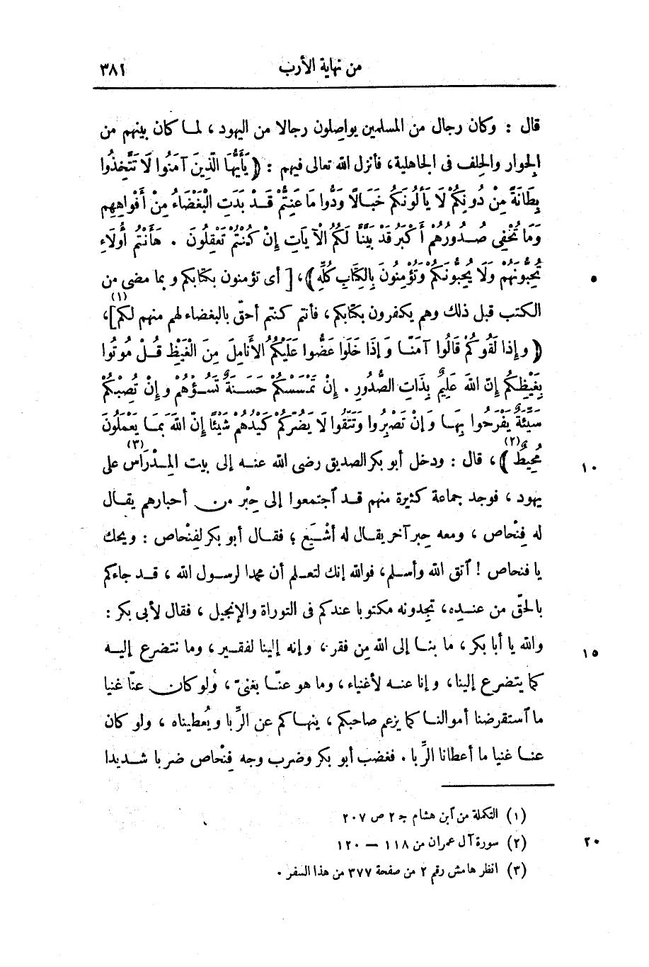 والله يا أبا بكر، ما بنا إلى الله من فقر، وإنه إلينا لفقير، وما نتضرع إليه كما يتضرع إلينا، وإنا عنه لأغنياء، وما هو عنّا بغنىّ، ولو كان عنّا غنيا ما استقرضنا أموالنا كما يزعم صاحبكم، ينهاكم عن الرّبا ويعطيناه، ولو كان عنا غنيا ما أعطانا الرّبا. فغضب أبو بكر وضرب وجه فنحاص ضربا شديدا