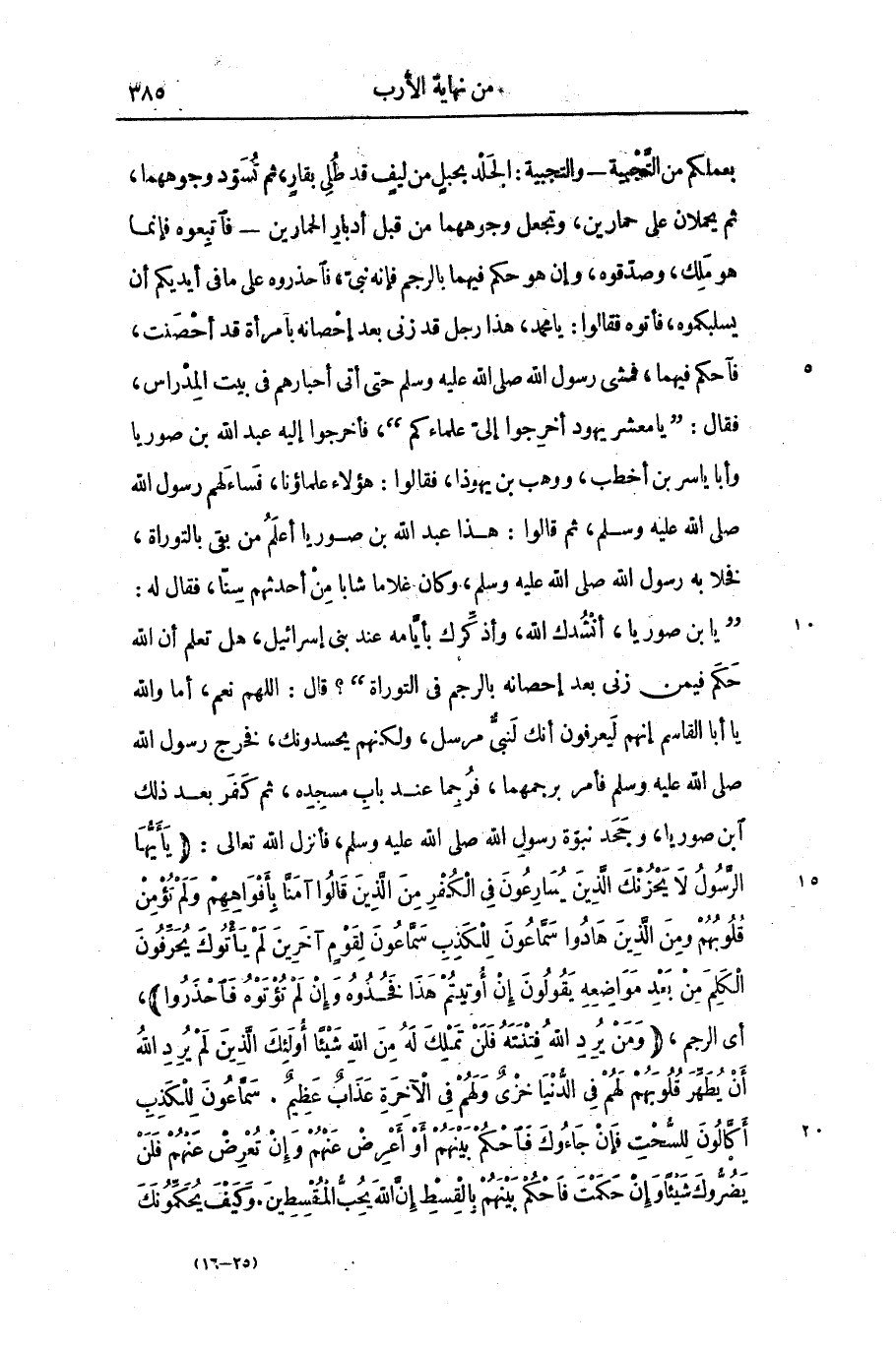 «يا بن صوريا، أنشدك الله، وأذكّرك بأيّامه عند بنى إسرائيل، هل تعلم أن الله حكم فيمن زنى بعد إحصانه بالرجم فى التوراة» ؟ قال: اللهم نعم، أما والله يا أبا القاسم إنهم ليعرفون أنك لنبىّ مرسل، ولكنهم يحسدونك، فخرج رسول الله صلى الله عليه وسلم فأمر برجمهما، فرجما عند باب مسجده، ثم كفر بعد ذلك ابن صوريا، وجحد نبوّة رسول الله صلى الله عليه وسلم، فأنزل الله تعالى: (يا أَيُّهَا الرَّسُولُ لا يَحْزُنْكَ الَّذِينَ يُسارِعُونَ فِي الْكُفْرِ مِنَ الَّذِينَ قالُوا آمَنَّا بِأَفْواهِهِمْ وَلَمْ تُؤْمِنْ قُلُوبُهُمْ وَمِنَ الَّذِينَ هادُوا سَمَّاعُونَ لِلْكَذِبِ سَمَّاعُونَ لِقَوْمٍ آخَرِينَ لَمْ يَأْتُوكَ يُحَرِّفُونَ الْكَلِمَ مِنْ بَعْدِ مَواضِعِهِ يَقُولُونَ إِنْ أُوتِيتُمْ هذا فَخُذُوهُ وَإِنْ لَمْ تُؤْتَوْهُ فَاحْذَرُوا)