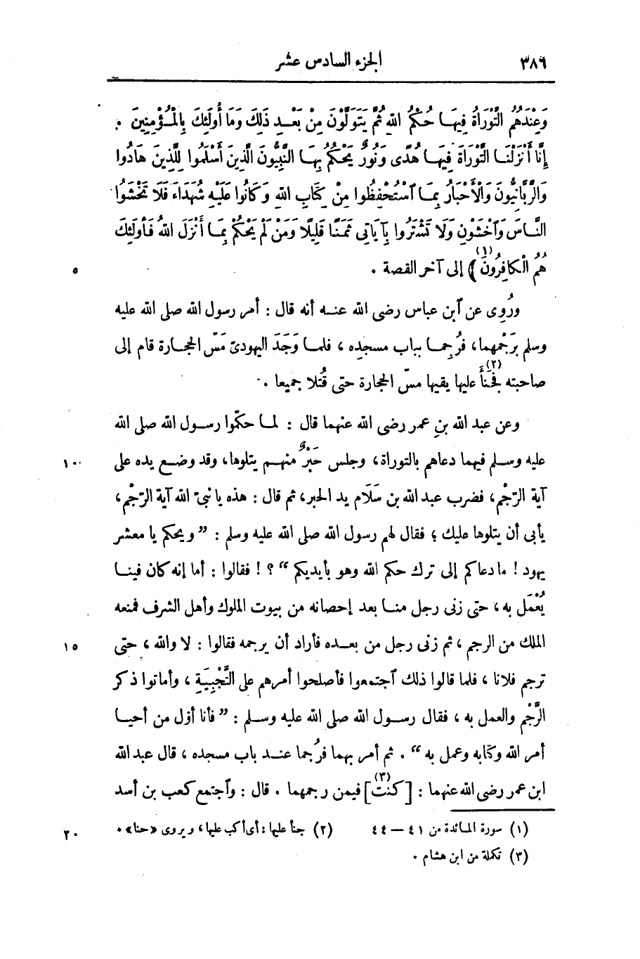 وعن عبد الله بن عمر رضى الله عنهما قال: لما حكّموا رسول الله صلى الله عليه وسلم فيهما دعاهم بالتوراة، وجلس حبر منهم يتلوها، وقد وضع يده على آية الرّجم، فضرب عبد الله بن سلام يد الحبر، ثم قال: هذه يا نبىّ الله آية الرّجم، يأبى أن يتلوها عليك؛ فقال لهم رسول الله صلى الله عليه وسلم: «ويحكم يا معشر يهود! ما دعاكم إلى ترك حكم الله وهو بأيديكم» ؟! فقالوا: أما إنه كان فينا يعمل به، حتى زنى رجل منا بعد إحصانه من بيوت الملوك وأهل الشرف فمنعه الملك من الرجم، ثم زنى رجل من بعده فأراد أن يرجمه فقالوا: لا والله، حتى ترجم فلانا، فلما قالوا ذلك اجتمعوا فأصلحوا أمرهم على التّجبية، وأماتوا ذكر الرّجم والعمل به، فقال رسول الله صلى الله عليه وسلم: «فأنا أوّل من أحيا أمر الله وكتابه وعمل به» . ثم أمر بهما فرجما عند باب مسجده، قال عبد الله ابن عمر رضى الله عنهما: [كنت «3» ] فيمن رجمهما. قال: واجتمع كعب بن أسد
