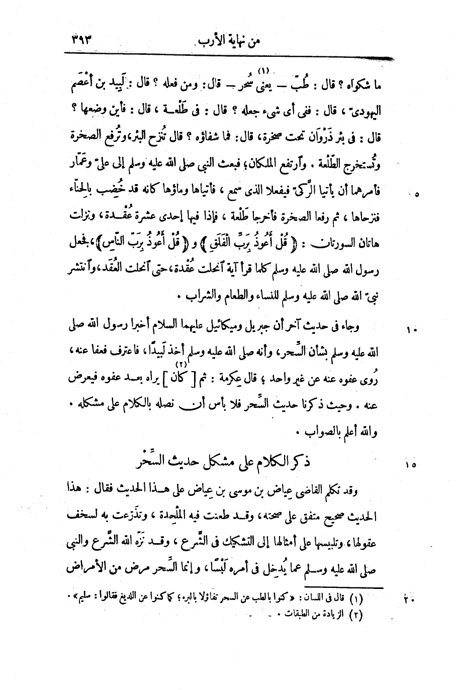 وجاء فى حديث آخر أن جبريل وميكائيل عليهما السلام أخبرا رسول الله صلى الله عليه وسلم بشأن السّحر، وأنه صلى الله عليه وسلم أخذ لبيدا، فاعترف فعفا عنه، روى عفوه عنه عن غير واحد؛ قال عكرمة: ثم [كان «2» ] يراه بعد عفوه فيعرض عنه. وحيث ذكرنا حديث السّحر فلا بأس أن نصله بالكلام على مشكله.