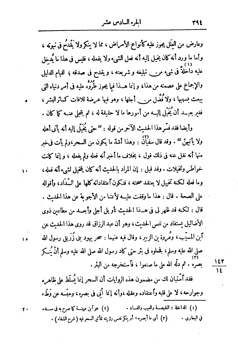 قال: لكنه قد ظهر لى فى هذا الحديث تأويل أجلى وأبعد من مطاعين ذوى الأضاليل يستفاد من نفس الحديث، وهو أن عبد الرزاق قد روى هذا الحديث عن ابن المسيّب، وعروة بن الزبير، وقال فيه عنهما: سحر يهود بنى زريق رسول الله صلى الله عليه وسلم، فجعلوه فى بئر حتى كاد رسول الله صلى الله عليه وسلم أن ينكر بصره «3» . ثم دلّه الله على ما صنعوا، فاستخرجه من البئر.