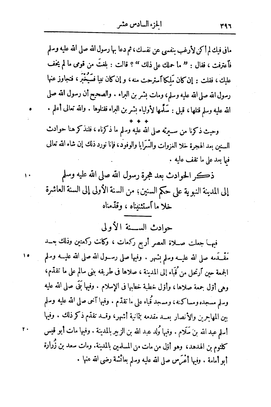 ذكر الحوادث بعد هجرة رسول الله صلى الله عليه وسلم إلى المدينة النبوية على حكم السنين؛ من السنة الأولى إلى السنة العاشرة خلا ما استثنيناه، وقدّمناه