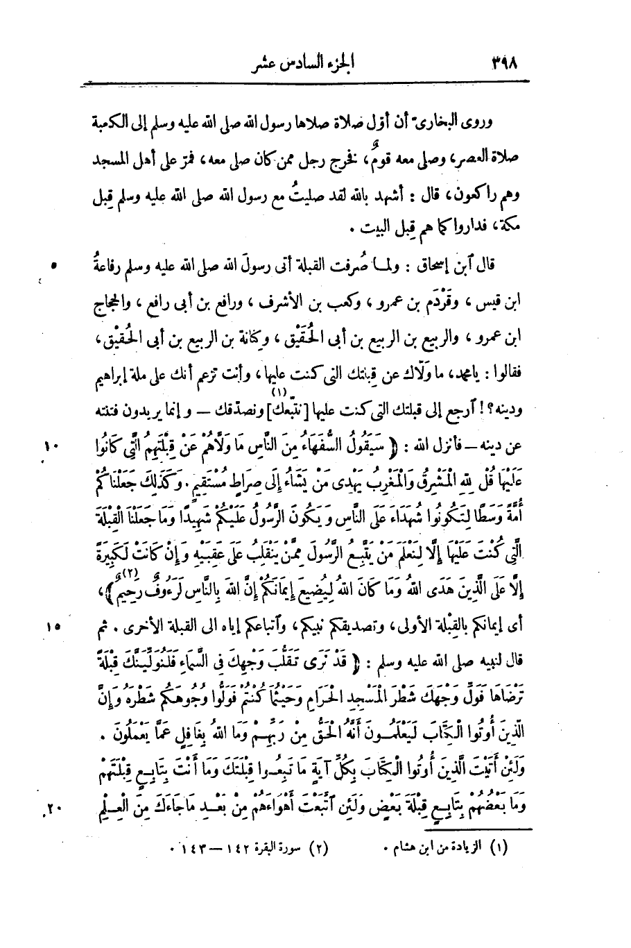 قال ابن إسحاق: ولما صرفت القبلة أتى رسول الله صلى الله عليه وسلم رفاعة ابن قيس، وقردم بن عمرو، وكعب بن الأشرف، ورافع بن أبى رافع، والحجاج ابن عمرو، والربيع بن الربيع بن أبى الحقيق، وكنانة بن الربيع بن أبى الحقيق، فقالوا: يا محمد، ما ولّاك عن قبلتك التى كنت عليها، وأنت تزعم أنك على ملة إبراهيم ودينه؟! ارجع إلى قبلتك التى كنت عليها [نتّبعك «1» ] ونصدّقك- وإنما يريدون فتنته عن دينه- فأنزل الله: (سَيَقُولُ السُّفَهاءُ مِنَ النَّاسِ ما وَلَّاهُمْ عَنْ قِبْلَتِهِمُ الَّتِي كانُوا عَلَيْها قُلْ لِلَّهِ الْمَشْرِقُ وَالْمَغْرِبُ يَهْدِي مَنْ يَشاءُ إِلى صِراطٍ مُسْتَقِيمٍ. وَكَذلِكَ جَعَلْناكُمْ أُمَّةً وَسَطاً لِتَكُونُوا شُهَداءَ عَلَى النَّاسِ وَيَكُونَ الرَّسُولُ عَلَيْكُمْ شَهِيداً وَما جَعَلْنَا الْقِبْلَةَ الَّتِي كُنْتَ عَلَيْها إِلَّا لِنَعْلَمَ مَنْ يَتَّبِعُ الرَّسُولَ مِمَّنْ يَنْقَلِبُ عَلى عَقِبَيْهِ وَإِنْ كانَتْ لَكَبِيرَةً إِلَّا عَلَى الَّذِينَ هَدَى اللَّهُ وَما كانَ اللَّهُ لِيُضِيعَ إِيمانَكُمْ إِنَّ اللَّهَ بِالنَّاسِ لَرَؤُفٌ رَحِيمٌ)