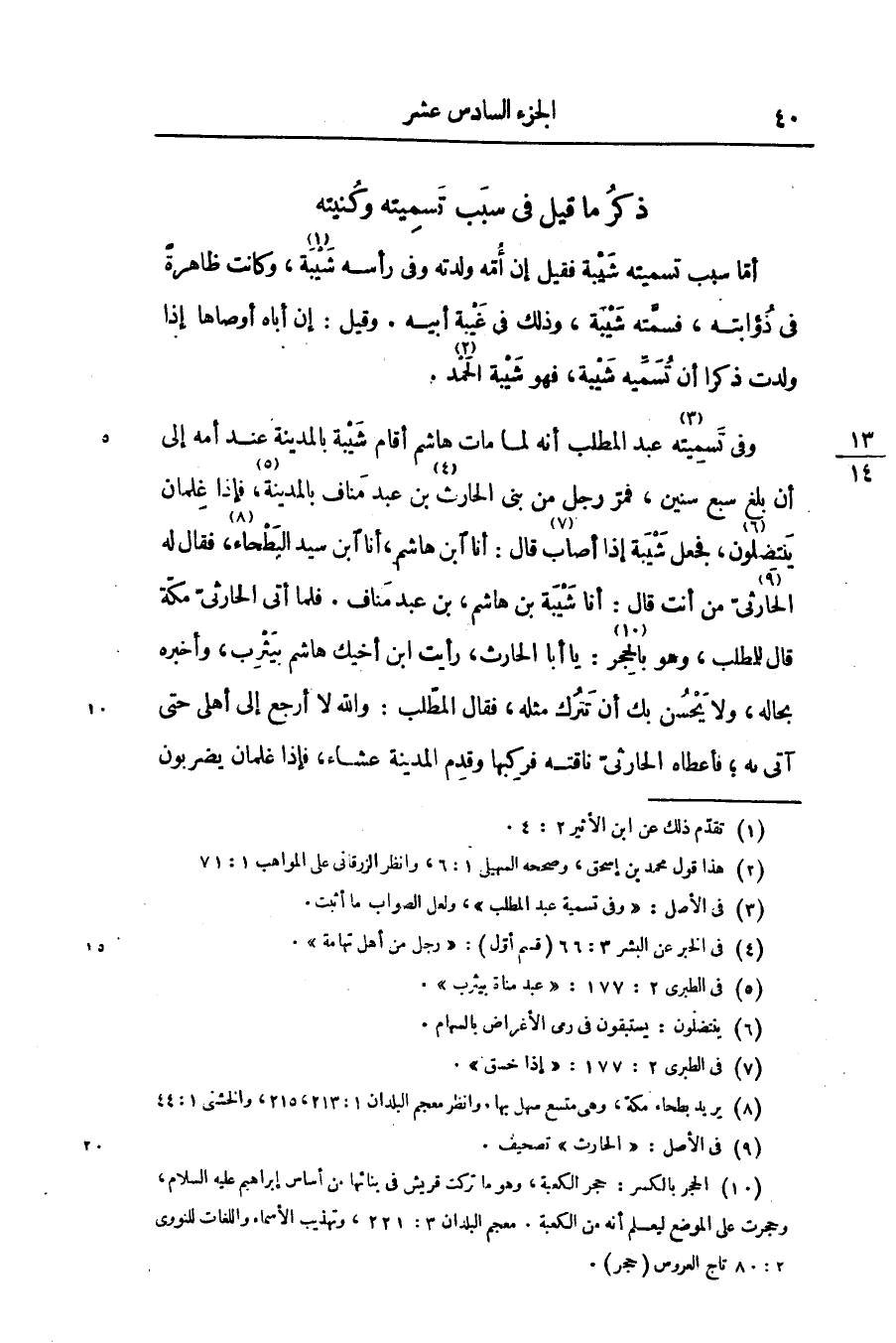 وفى تسميته «3» عبد المطلب أنه لما مات هاشم أقام شيبة بالمدينة عند أمه إلى أن بلغ سبع سنين، فمرّ رجل من بنى الحارث «4» بن عبد مناف بالمدينة «5» ، فإذا غلمان ينتضلون «6» ، فجعل شيبة إذا أصاب «7» قال: أنا ابن هاشم، أنا ابن سيد البطحاء «8» ، فقال له الحارثىّ «9» من أنت قال: أنا شيبة بن هاشم، بن عبد مناف. فلما أتى الحارثىّ مكّة قال للمطلب، وهو بالحجر «10» : يا أبا الحارث، رأيت ابن أخيك هاشم بيثرب، وأخبره بحاله، ولا يحسن بك أن تترك مثله، فقال المطّلب: والله لا أرجع إلى أهلى حتى آتى به؛ فأعطاه الحارثىّ ناقته فركبها وقدم المدينة عشاء، فإذا غلمان يضربون