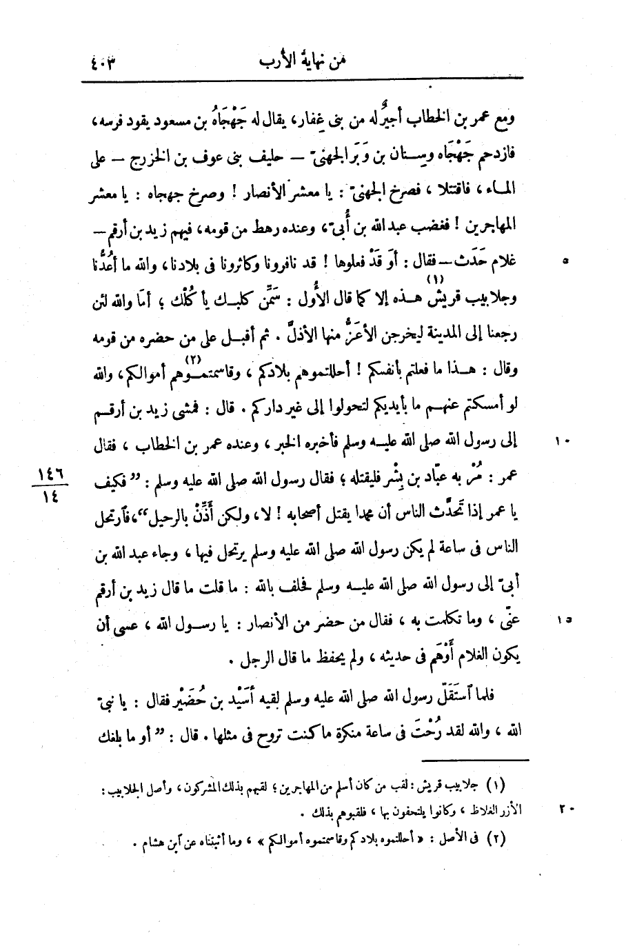 ومع عمر بن الخطاب أجير له من بنى غفار، يقال له جهجاه بن مسعود يقود فرسه، فازدحم جهجاه وسنان بن وبر الجهنىّ- حليف بنى عوف بن الخزرج- على الماء، فاقتتلا، فصرخ الجهنىّ: يا معشر الأنصار! وصرخ جهجاه: يا معشر المهاجرين! فغضب عبد الله بن أبىّ، وعنده رهط من قومه، فيهم زيد بن أرقم- غلام حدث- فقال: أو قد فعلوها! قد نافرونا وكاثرونا فى بلادنا، والله ما أعدّنا وجلابيب قريش «1» هذه إلا كما قال الأول: سمّن كلبك يأكلك؛ أما والله لئن رجعنا إلى المدينة ليخرجن الأعزّ منها الأذلّ. ثم أقبل على من حضره من قومه وقال: هذا ما فعلتم بأنفسكم! أحللتموهم بلادكم، وقاسمتموهم «2» أموالكم، والله لو أمسكتم عنهم ما بأيديكم لتحولوا إلى غير داركم. قال: فمشى زيد بن أرقم إلى رسول الله صلى الله عليه وسلم فأخبره الخبر، وعنده عمر بن الخطاب، فقال عمر: مر به عبّاد بن بشر فليقتله؛ فقال رسول الله صلى الله عليه وسلم: «فكيف يا عمر إذا تحدّث الناس أن محمدا يقتل أصحابه! لا، ولكن أذّن بالرحيل» ، فارتحل الناس فى ساعة لم يكن رسول الله صلى الله عليه وسلم يرتحل فيها، وجاء عبد الله بن أبىّ إلى رسول الله صلى الله عليه وسلم فحلف بالله: ما قلت ما قال زيد بن أرقم عنّى، وما تكلمت به، فقال من حضر من الأنصار: يا رسول الله، عسى أن يكون الغلام أوهم فى حديثه، ولم يحفظ ما قال الرجل.
