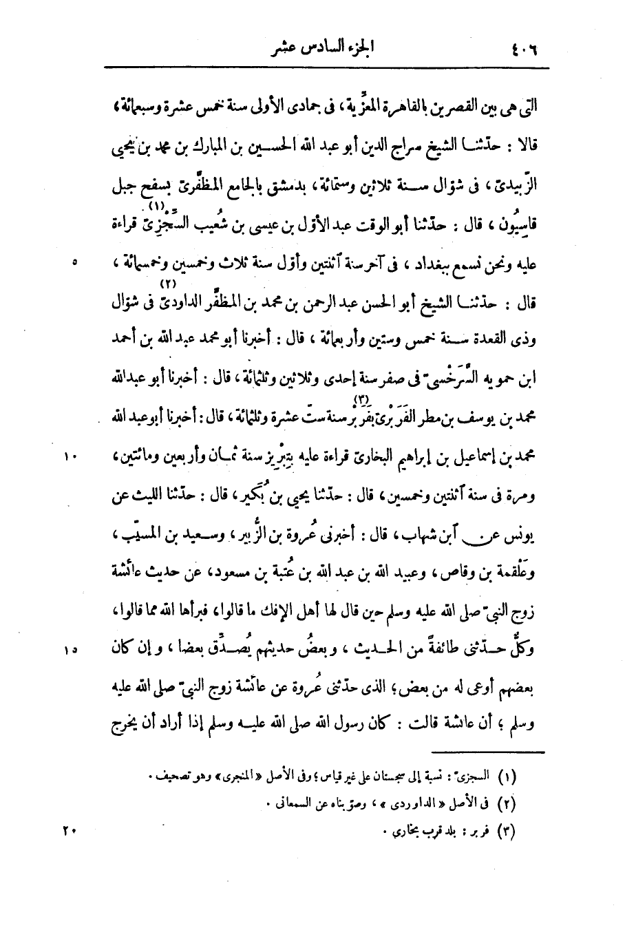 التى هى بين القصرين بالقاهرة المعزّية، فى جمادى الأولى سنة خمس عشرة وسبعمائة، قالا: حدّثنا الشيخ سراج الدين أبو عبد الله الحسين بن المبارك بن محمد بن يحيى الزّبيدىّ، فى شوّال سنة ثلاثين وستمائة، بدمشق بالجامع المظفّرىّ بسفح جبل قاسيون، قال: حدّثنا أبو الوقت عبد الأوّل بن عيسى بن شعيب السّجزىّ «1» قراءة عليه ونحن نسمع ببغداد، فى آخر سنة اثنتين وأوّل سنة ثلاث وخمسين وخمسمائة، قال: حدّثنا الشيخ أبو الحسن عبد الرحمن بن محمد بن المظفّر الداودىّ «2» فى شوّال وذى القعدة سنة خمس وستين وأربعمائة، قال: أخبرنا أبو محمد عبد الله بن أحمد ابن حمويه السّرخسىّ فى صفر سنة إحدى وثلاثين وثلاثمائة، قال: أخبرنا أبو عبد الله محمد بن يوسف بن مطر الفربرىّ بفر «3» بر سنة ستّ عشرة وثلاثمائة، قال: أخبرنا أبو عبد الله محمد بن إسماعيل بن إبراهيم البخارىّ قراءة عليه بتبريز سنة ثمان وأربعين ومائتين، ومرة فى سنة اثنتين وخمسين، قال: حدّثنا يحيى بن بكير، قال: حدّثنا الليث عن يونس عن ابن شهاب، قال: أخبرنى عروة بن الزّبير، وسعيد بن المسيّب، وعلقمة بن وقاص، وعبيد الله بن عبد الله بن عتبة بن مسعود، عن حديث عائشة زوج النبىّ صلى الله عليه وسلم حين قال لها أهل الإفك ما قالوا، فبرأها الله مما قالوا، وكلّ حدّثنى طائفة من الحديث، وبعض حديثهم يصدّق بعضا، وإن كان بعضهم أوعى له من بعض؛ الذى حدّثنى عروة عن عائشة زوج النبىّ صلى الله عليه وسلم؛ أن عائشة قالت: كان رسول الله صلى الله عليه وسلم إذا أراد أن يخرج