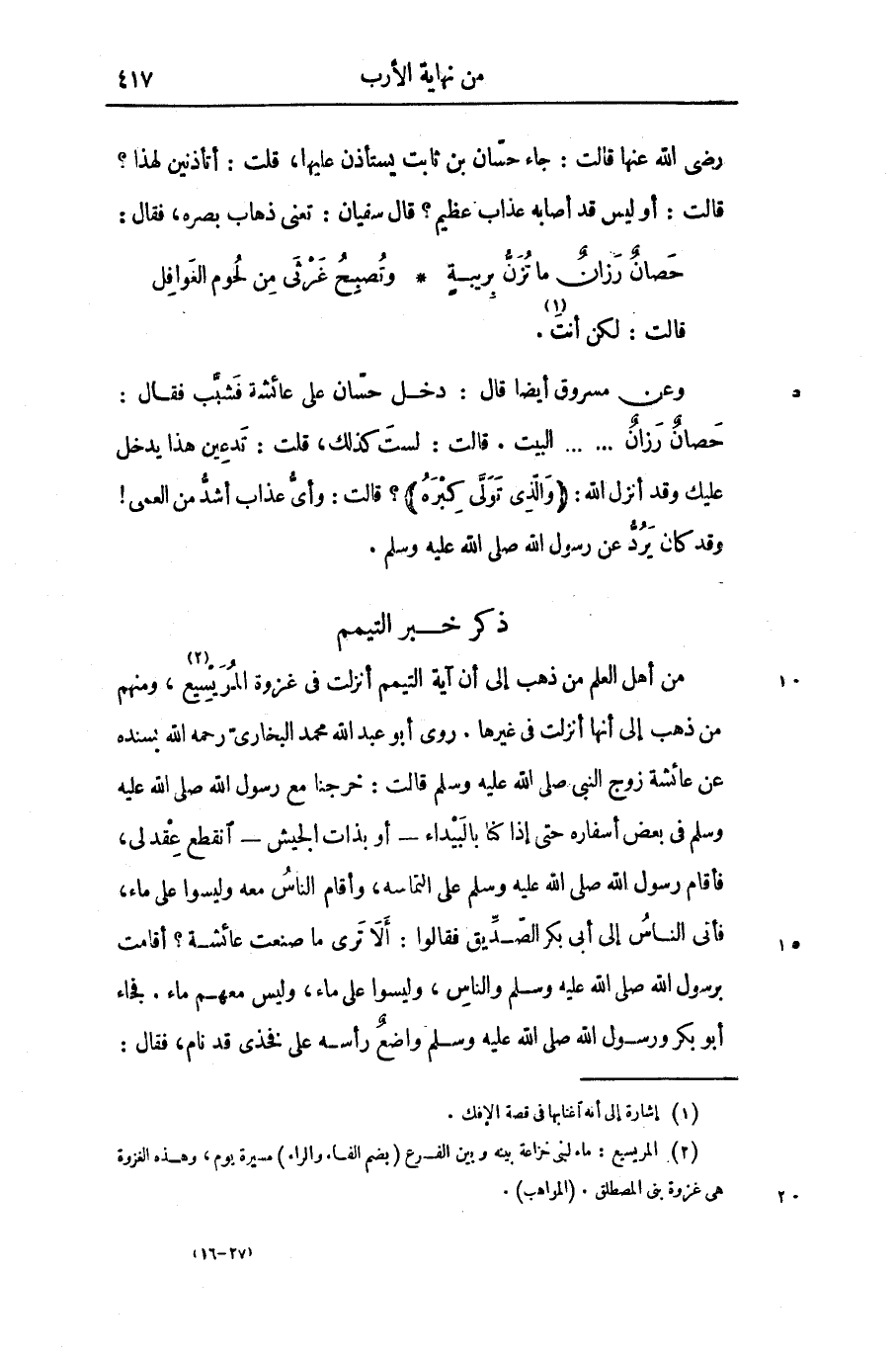 من أهل العلم من ذهب إلى أن آية التيمم أنزلت فى غزوة المريسيع «2» ، ومنهم من ذهب إلى أنها أنزلت فى غيرها. روى أبو عبد الله محمد البخارىّ رحمه الله بسنده عن عائشة زوج النبى صلى الله عليه وسلم قالت: خرجنا مع رسول الله صلى الله عليه وسلم فى بعض أسفاره حتى إذا كنا بالبيداء- أو بذات الجيش- انقطع عقد لى، فأقام رسول الله صلى الله عليه وسلم على التماسه، وأقام الناس معه وليسوا على ماء، فأتى الناس إلى أبى بكر الصّدّيق فقالوا: ألا ترى ما صنعت عائشة؟ أقامت برسول الله صلى الله عليه وسلم والناس، وليسوا على ماء، وليس معهم ماء. فجاء أبو بكر ورسول الله صلى الله عليه وسلم واضع رأسه على فخذى قد نام، فقال: