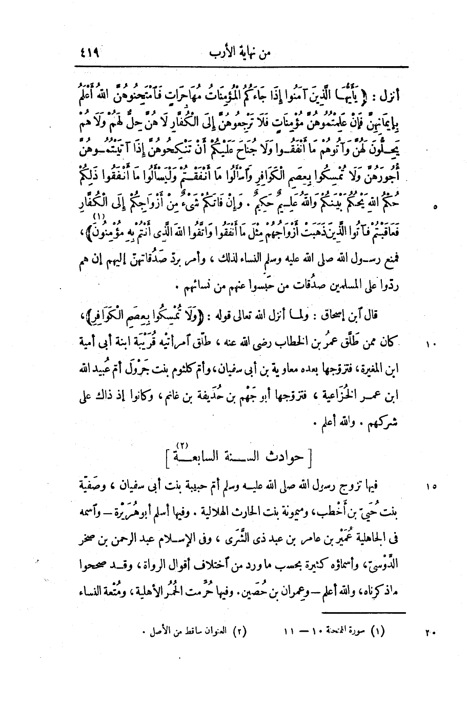 أنزل: (يا أَيُّهَا الَّذِينَ آمَنُوا إِذا جاءَكُمُ الْمُؤْمِناتُ مُهاجِراتٍ فَامْتَحِنُوهُنَّ اللَّهُ أَعْلَمُ بِإِيمانِهِنَّ فَإِنْ عَلِمْتُمُوهُنَّ مُؤْمِناتٍ فَلا تَرْجِعُوهُنَّ إِلَى الْكُفَّارِ لا هُنَّ حِلٌّ لَهُمْ وَلا هُمْ يَحِلُّونَ لَهُنَّ وَآتُوهُمْ ما أَنْفَقُوا وَلا جُناحَ عَلَيْكُمْ أَنْ تَنْكِحُوهُنَّ إِذا آتَيْتُمُوهُنَّ أُجُورَهُنَّ وَلا تُمْسِكُوا بِعِصَمِ الْكَوافِرِ وَسْئَلُوا ما أَنْفَقْتُمْ وَلْيَسْئَلُوا ما أَنْفَقُوا ذلِكُمْ حُكْمُ اللَّهِ يَحْكُمُ بَيْنَكُمْ وَاللَّهُ عَلِيمٌ حَكِيمٌ. وَإِنْ فاتَكُمْ شَيْءٌ مِنْ أَزْواجِكُمْ إِلَى الْكُفَّارِ فَعاقَبْتُمْ فَآتُوا الَّذِينَ ذَهَبَتْ أَزْواجُهُمْ مِثْلَ ما أَنْفَقُوا وَاتَّقُوا اللَّهَ الَّذِي أَنْتُمْ بِهِ مُؤْمِنُونَ)