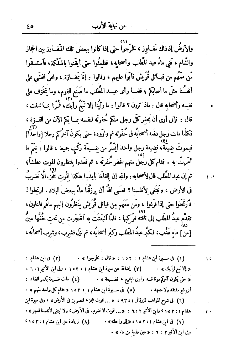 والأرض إذ ذاك مفاوز، فخرجوا «1» حتى إذا كانوا ببعض تلك المفاوز بين الحجاز والشّام، فنى ماء عبد المطّلب وأصحابه، فظمئوا حتى أيقنوا بالهلكة، فاستسقوا من معهم من قبائل قريش فأبوا عليهم، وقالوا: إنّا بمفازة، ونحن نخشى على أنفسنا مثل ما أصابكم؛ فلما رأى عبد المطّلب ما صنع القوم، وما يتخوّف على نفسه وأصحابه قال: ماذا ترون؟ قالوا: ما رأينا إلا تبع رأيك «2» ، فمرنا بما شئت، قال: فإنى أرى أن يحفر كلّ رجل منكم حفرته لنفسه بما بكم الآن من القوّة، فكلّما مات رجل دفعه أصحابه فى حفرته ثم واروه، حتى يكون آخركم رجلا [واحدا «3» ] فيموت ضيعة «4» ، فضيعة رجل واحد أيسر من ضيعة ركب جميعا، قالوا: نعم ما أمرت به. فقام كل رجل «5» منهم فحفر حفرته، ثم قعدوا ينتظرون الموت عطشا؛ ثم إن عبد المطّلب قال لأصحابه: والله إن إلقاءنا بأيدينا هكذا للموت عجز «6» ، ألا نضرب فى الأرض، ونبتغى لأنفسنا؟ فعسى الله أن يرزقنا ماء ببعض البلاد. ارتحلوا! فارتحلوا حتى إذا فرغوا، ومن معهم من قبائل قريش ينظرون إليهم ما هم فاعلون، تقدّم عبد المطّلب إلى ناقته «7» فركبها، فلمّا انبعثت به انفجرت من تحت خفّها عين [من «8» ] ماء عذب، فكبّر عبد المطّلب وكبر أصحابه، ثم نزل فشرب، وشرب أصحابه،