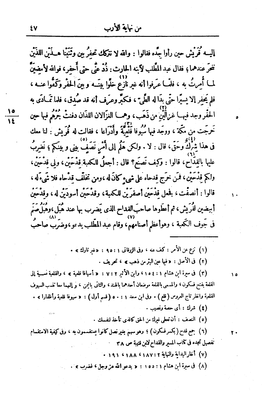 إليه قريش حين رأوا جدّه فقالوا: والله لا نتركك تحفر بين وثنينا هذين اللذين ننحر عندهما؛ فقال عبد المطّلب لابنه الحارث: ذد عنّى حتى أحفر، فو الله لأمضينّ لما أمرت به، فلمّا عرفوا أنه غير نازع «1» خلّوا بينه وبين الحفر وكفّوا عنه، فلم يحفر إلا يسيرا حتّى بدا له الطّىّ، فكبّر وعرف أنه قد صدق، فلما تمادى به الحفر وجد فيها غزالين «2» من ذهب، وهما الغزالان اللذان دفنت جرهم فيها حين خرجت من مكّة، ووجد فيها سيوفا قلعيّة «3» وأدراعا، فقالت له قريش: لنا معك فى هذا شرك»