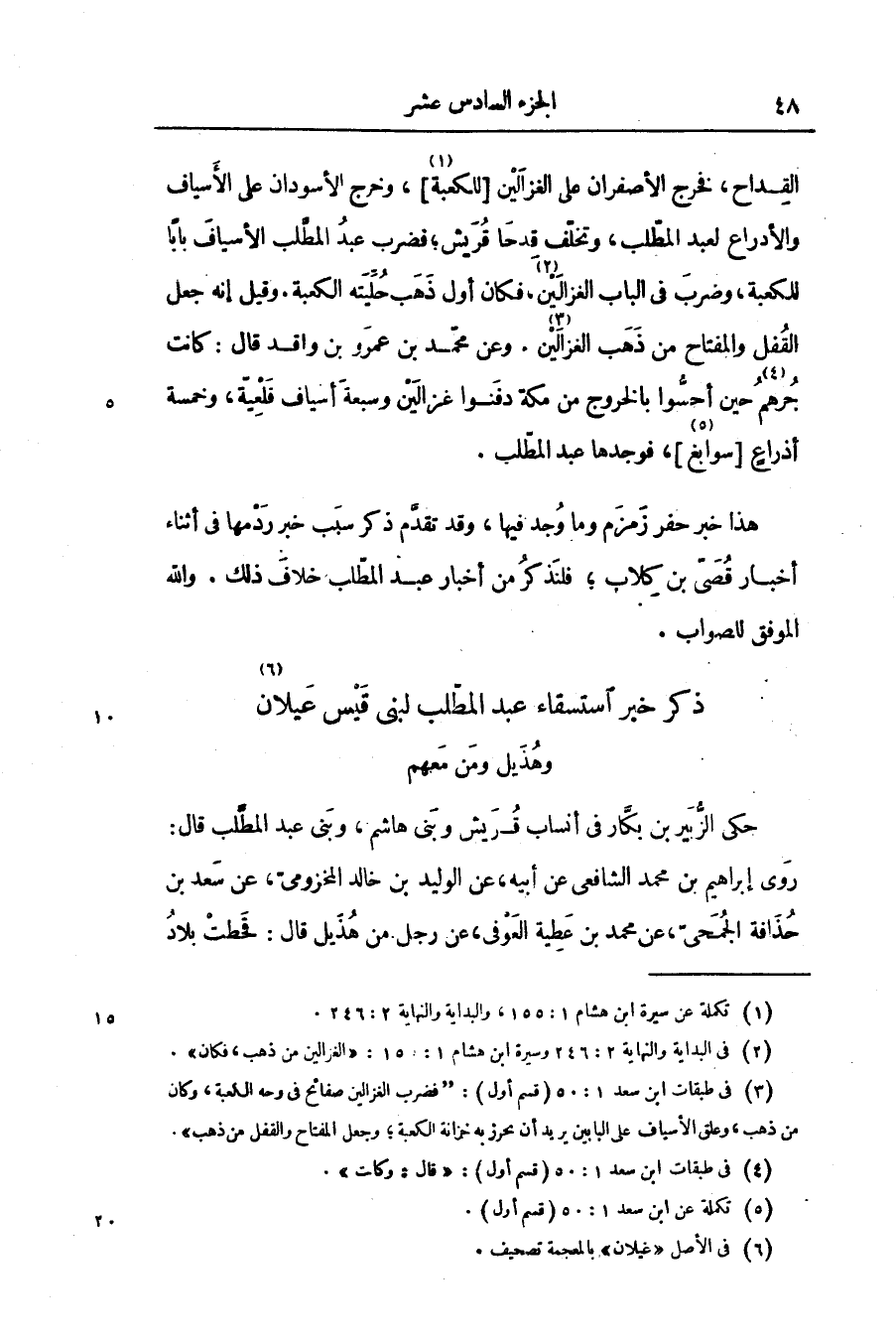 القداح، فخرج الأصفران على الغزالين [للكعبة «1» ] ، وخرج الأسودان على الأسياف والأدراع لعبد المطّلب، وتخلّف قدحا قريش؛ فضرب عبد المطّلب الأسياف بابا للكعبة، وضرب فى الباب الغزالين «2» ، فكان أول ذهب حلّيته الكعبة. وقيل إنه جعل القفل والمفتاح من ذهب الغزالين «3» . وعن محمّد بن عمرو بن واقد قال: كانت جرهم «4» حين أحسّوا بالخروج من مكة دفنوا غزالين وسبعة أسياف قلعيّة، وخمسة أذراع [سوابغ «5» ] ، فوجدها عبد المطّلب.