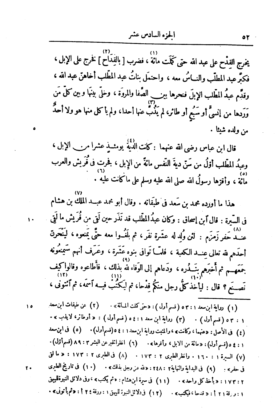 قال ابن عباس رضى الله عنهما: كانت الدية «4» يومئذ عشرا من الإبل، وعبد المطّلب أوّل من سنّ دية النّفس مائة من الإبل، فجرت فى قريش والعرب مائة «5» ، وأقرّها رسول الله صلى الله عليه وسلم على ما كانت عليه «6» .