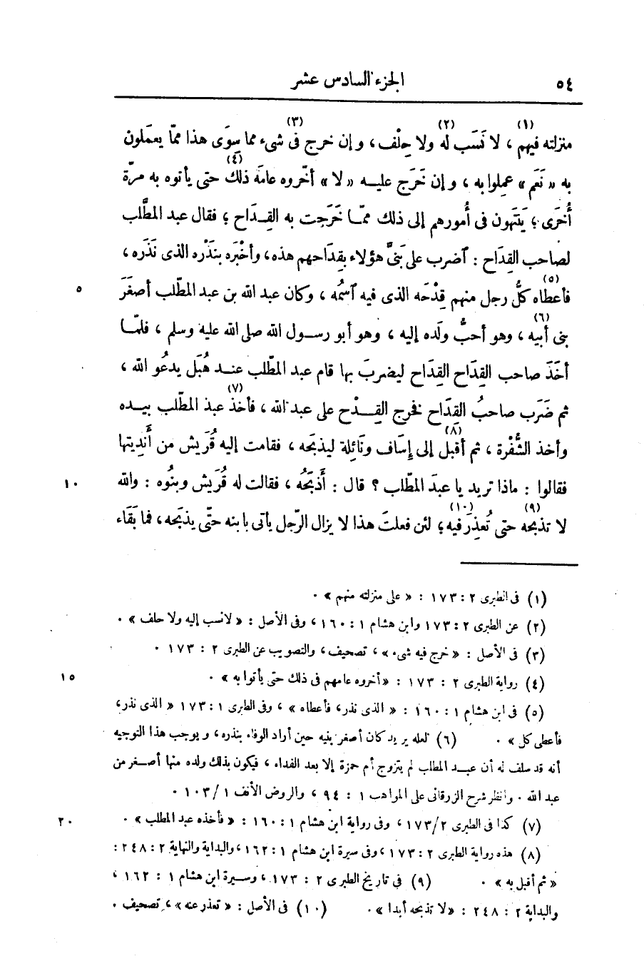 منزلته فيهم «1» ، لا نسب له «2» ولا حلف، وإن خرج فى «3» شىء مما سوى هذا ممّا يعملون به «نعم» عملوا به، وإن خرج عليه «لا» أخّروه عامه ذلك «4» حتى يأتوه به مرّة أخرى؛ ينتهون فى أمورهم إلى ذلك ممّا خرجت به القداح؛ فقال عبد المطّلب لصاحب القداح: اضرب على بنىّ هؤلاء بقداحهم هذه، وأخبره بنذره الذى نذره، فأعطاه «5» كلّ رجل منهم قدحه الذى فيه اسمه، وكان عبد الله بن عبد المطّلب أصغر بنى أبيه «6» ، وهو أحبّ ولده إليه، وهو أبو رسول الله صلى الله عليه وسلم، فلمّا أخذ صاحب القداح القداح ليضرب بها قام عبد المطّلب عند هبل يدعو الله، ثم ضرب صاحب القداح فخرج القدح على عبد الله، فأخذ «7» عبد المطّلب بيده وأخذ الشّفرة، ثم أقبل «8» إلى إساف ونائلة ليذبحه، فقامت إليه قريش من أنديتها فقالوا: ماذا تريد يا عبد المطّلب؟ قال: أذبحه، فقالت له قريش وبنوه: والله لا تذبحه «9» حتى تعذر «10» فيه؛ لئن فعلت هذا لا يزال الرّجل يأتى بابنه حتّى يذبحه، فما بقاء