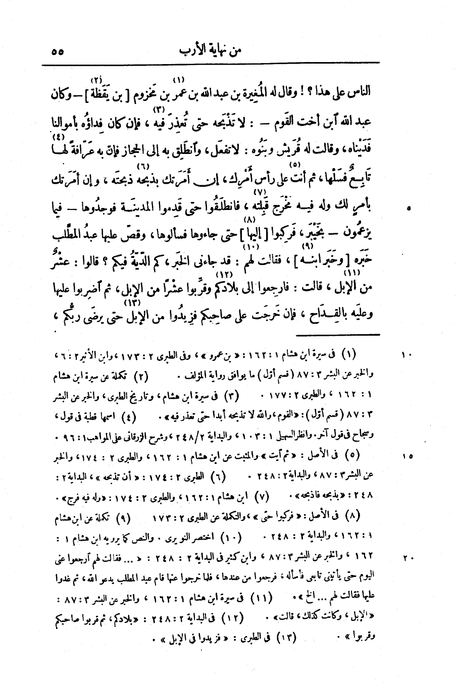 الناس على هذا؟! وقال له المغيرة بن عبد الله بن عمر «1» بن مخزوم [بن يقظة «2» ]- وكان عبد الله ابن أخت القوم-: لا تذبحه حتى تعذر فيه «3» ، فإن كان فداؤه بأموالنا فديناه، وقالت له قريش وبنوه: لا تفعل، وانطلق به إلى الحجاز فإنّ به عرّافة لها «4» تابع فسلها، ثم أنت «5» على رأس أمرك، إن أمرتك بذبحه «6» ذبحته، وإن أمرتك بأمر لك وله فيه مخرج قبلته «7» ، فانطلقوا حتى قدموا المدينة فوجدوها- فيما يزعمون- بخيبر، فركبوا [إليها «8» ] حتى جاءوها فسألوها، وقصّ عليها عبد المطّلب خبره [وخبر ابنه «9» ] ، فقالت لهم «10» : قد جاءنى الخبر، كم الدّيّة فيكم؟ قالوا: عشر من الإبل «11» ، قالت: فارجعوا إلى بلادكم «12» وقرّبوا عشرا من الإبل، ثم اضربوا عليها وعليه بالقداح، فإن خرجت على صاحبكم فزيدوا من الإبل «13» حتى يرضى ربّكم،