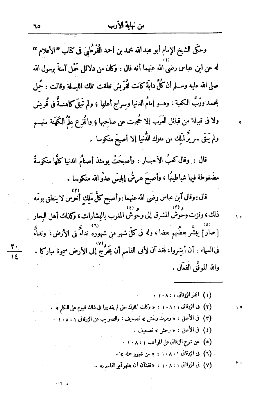 قال: وقال ابن عباس رضى الله عنهما: وأصبح كلّ ملك أخرس «2» لا ينطق يومه ذلك، وفرّت وحوش «3» المشرق إلى وحوش «4» المغرب بالبشارات، وكذلك أهل البحار [صار «5» ] يبشّر بعضهم بعضا، وله فى كلّ شهر من شهوره «6» نداء فى الأرض، ونداء فى السماء: أن أبشروا، فقد آن لأبى القاسم أن يخرج «7» إلى الأرض ميمونا مباركا.