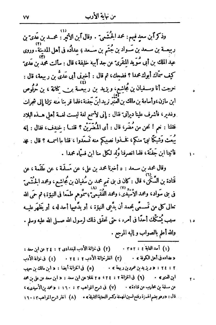 خرجت أنا وسفيان بن مجاشع، ويزيد بن ربيعة «4» بن كنانة، بن حرقوص ابن مازن، وأسامة بن مالك بن العنبر «5» نريد ابن جفنة، فلما قربنا منه نزلنا إلى شجرات وغدير، فأشرف علينا ديرانىّ فقال: إنى لأسمع لغة ليست لغة أهل هذه البلاد فقلنا: نعم! نحن من مضر، قال: أى المضرين؟ قلنا: خندف، فقال: إنه يبعث وشيكا نبىّ منكم، فخذوا نصيبكم منه تسعدوا، قلنا ما اسمه؟ قال: محمد فأتينا ابن جفنة، فلما انصرفنا ولد لكل منا ابن فسمّاه محمدا.