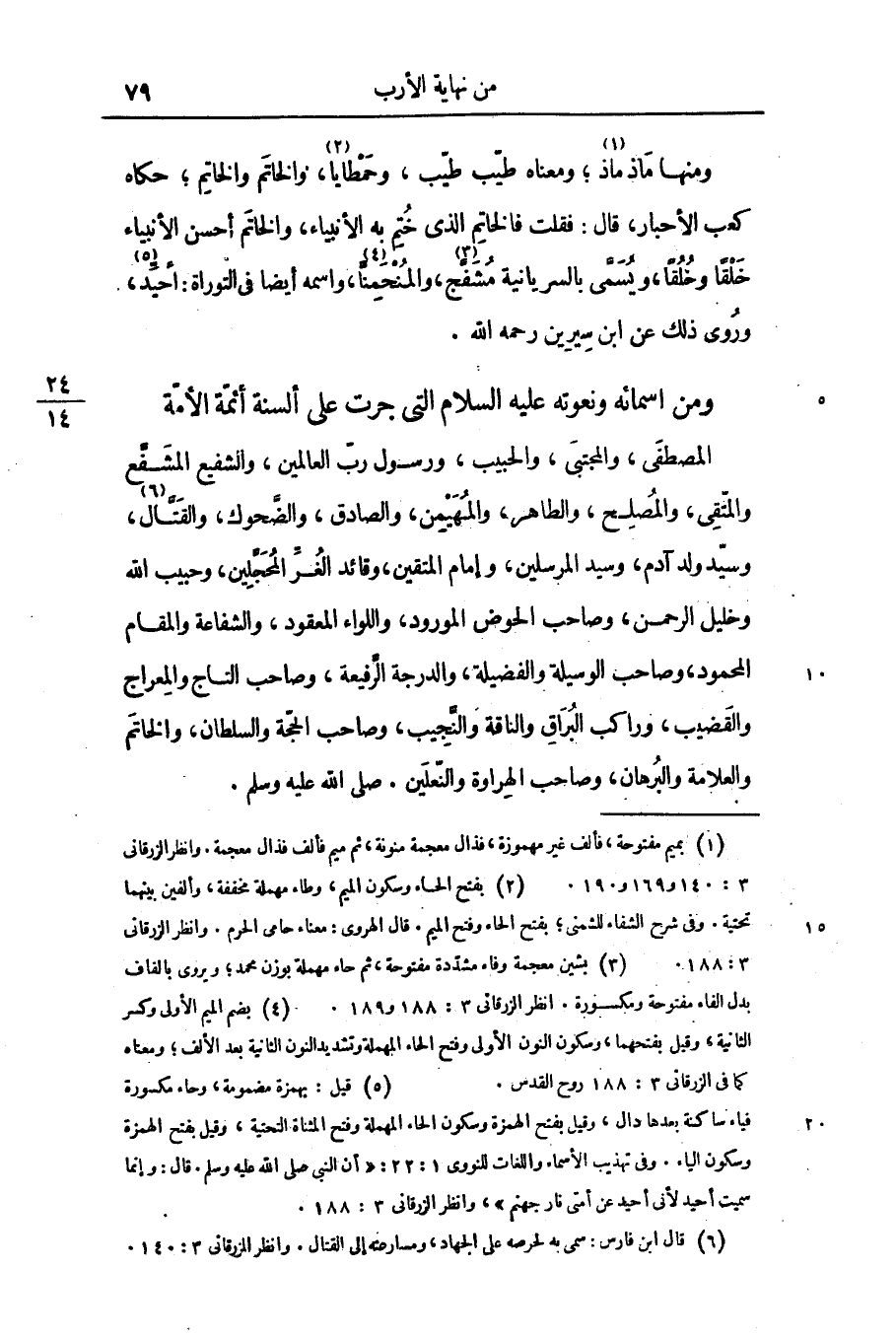 المصطفى، والمجتبى، والحبيب، ورسول ربّ العالمين، والشفيع المشفّع والمتّقى، والمصلح، والطاهر، والمهيمن، والصادق، والضّحوك، والقتّال «6» ، وسيّد ولد آدم، وسيد المرسلين، وإمام المتقين، وقائد الغرّ المحجّلين، وحبيب الله وخليل الرحمن، وصاحب الحوض المورود، واللواء المعقود، والشفاعة والمقام المحمود، وصاحب الوسيلة والفضيلة، والدرجة الرّفيعة، وصاحب التاج والمعراج والقضيب، وراكب البراق والناقة والنّجيب، وصاحب الحجّة والسلطان، والخاتم والعلامة والبرهان، وصاحب الهراوة والنّعلين. صلى الله عليه وسلم.