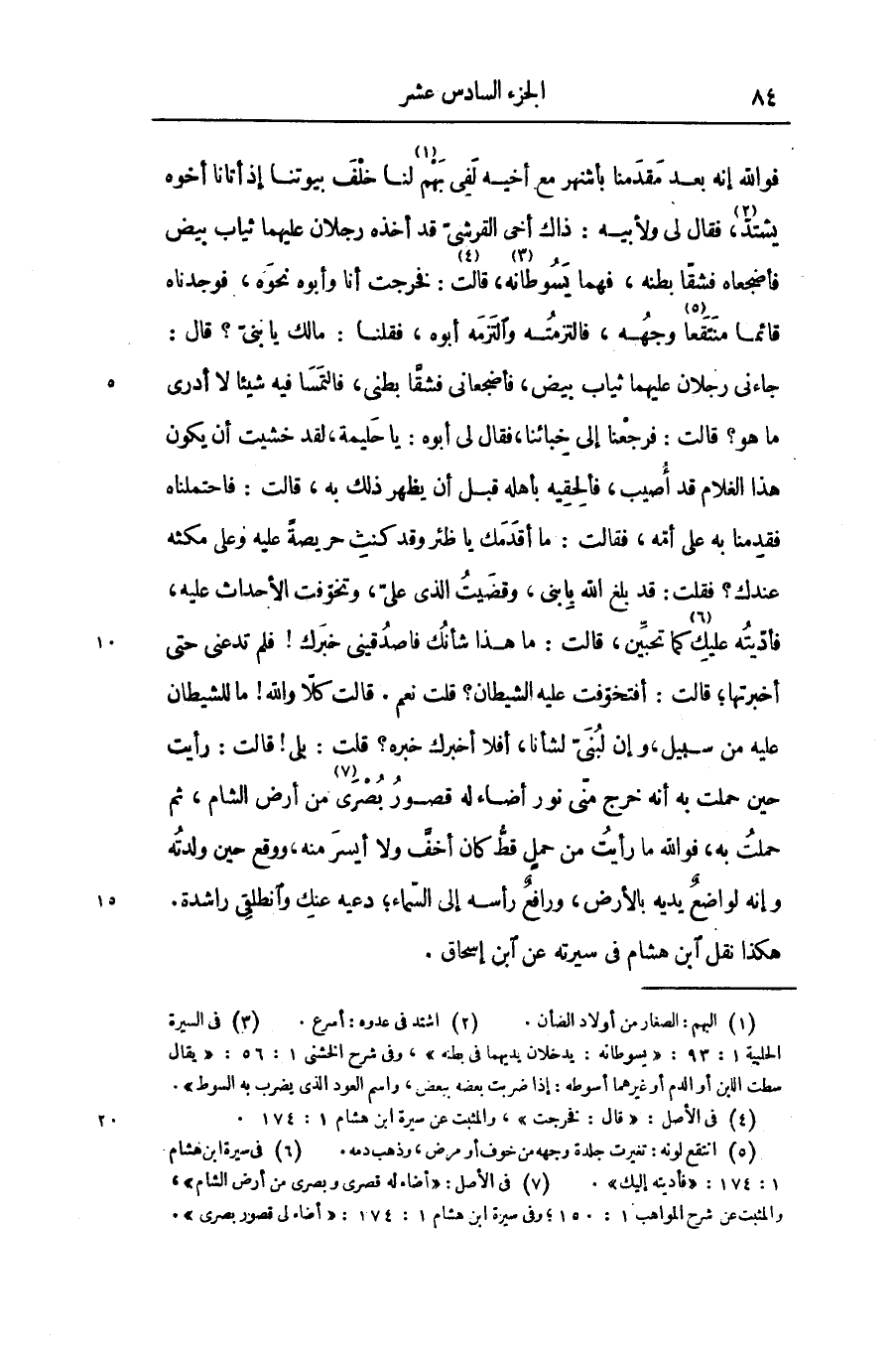فو الله إنه بعد مقدمنا بأشنهر مع أخيه لفى بهم «1» لنا خلف بيوتنا إذ أتانا أخوه يشتدّ «2» ، فقال لى ولأبيه: ذاك أخى القرشىّ قد أخذه رجلان عليهما ثياب بيض فأضجعاه فشقّا بطنه، فهما يسوطانه «3» ، قالت «4» : فخرجت أنا وأبوه نحوه، فوجدناه قائما منتقعا «5» وجهه، فالتزمته والتزمه أبوه، فقلنا: مالك يا بنىّ؟ قال: