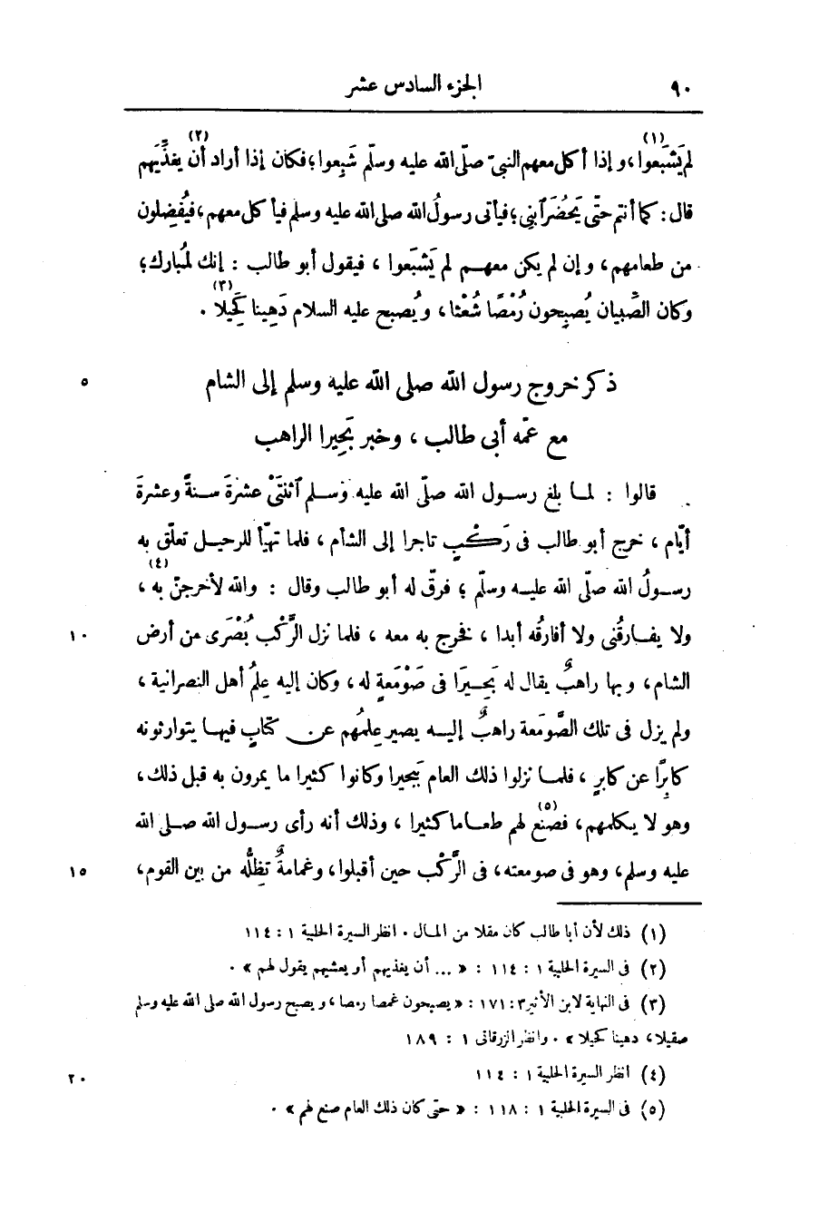 قالوا: لما بلغ رسول الله صلّى الله عليه وسلم اثنتى عشرة سنة وعشرة أيّام، خرج أبو طالب فى ركب تاجرا إلى الشأم، فلما تهيّأ للرحيل تعلّق به رسول الله صلّى الله عليه وسلّم؛ فرقّ له أبو طالب وقال: والله لأخرجنّ به «4» ، ولا يفارقنى ولا أفارقه أبدا، فخرج به معه، فلما نزل الرّكب بصرى من أرض الشام، وبها راهب يقال له بحيرا فى صومعة له، وكان إليه علم أهل النصرانية، ولم يزل فى تلك الصّومعة راهب إليه يصير علمهم عن كتاب فيها يتوارثونه كابرا عن كابر، فلما نزلوا ذلك العام ببحيرا وكانوا كثيرا ما يمرون به قبل ذلك، وهو لا يكلمهم، فصنع «5» لهم طعاما كثيرا، وذلك أنه رأى رسول الله صلى الله عليه وسلم، وهو فى صومعته، فى الرّكب حين أقبلوا، وغمامة تظلّه من بين القوم،