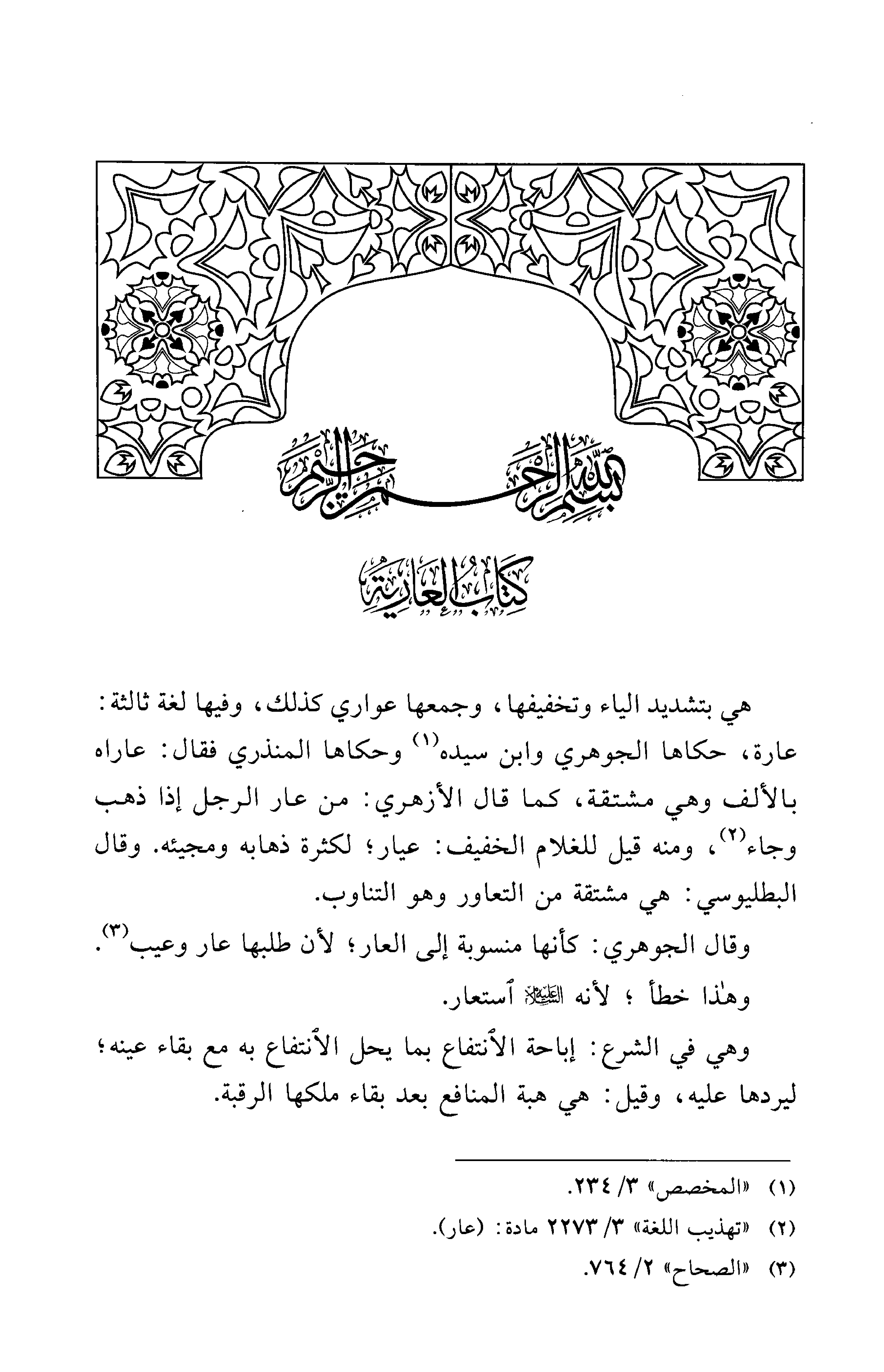 هي بتشديد الياء وتخفيفها، وجمعها عواري كذلك، وفيها لغة ثالثة: عارة، حكاها الجوهري وابن سيده (¬1) وحكاها المنذري فقال: عاراه بالألف وهي مشتقة، كما قال الأزهري: من عار الرجل إذا ذهب وجاء (¬2)، ومنه قيل للغلام الخفيف: عيار؛ لكثرة ذهابه ومجيئه. وقال البطليوسي: هي مشتقة من التعاور وهو التناوب.