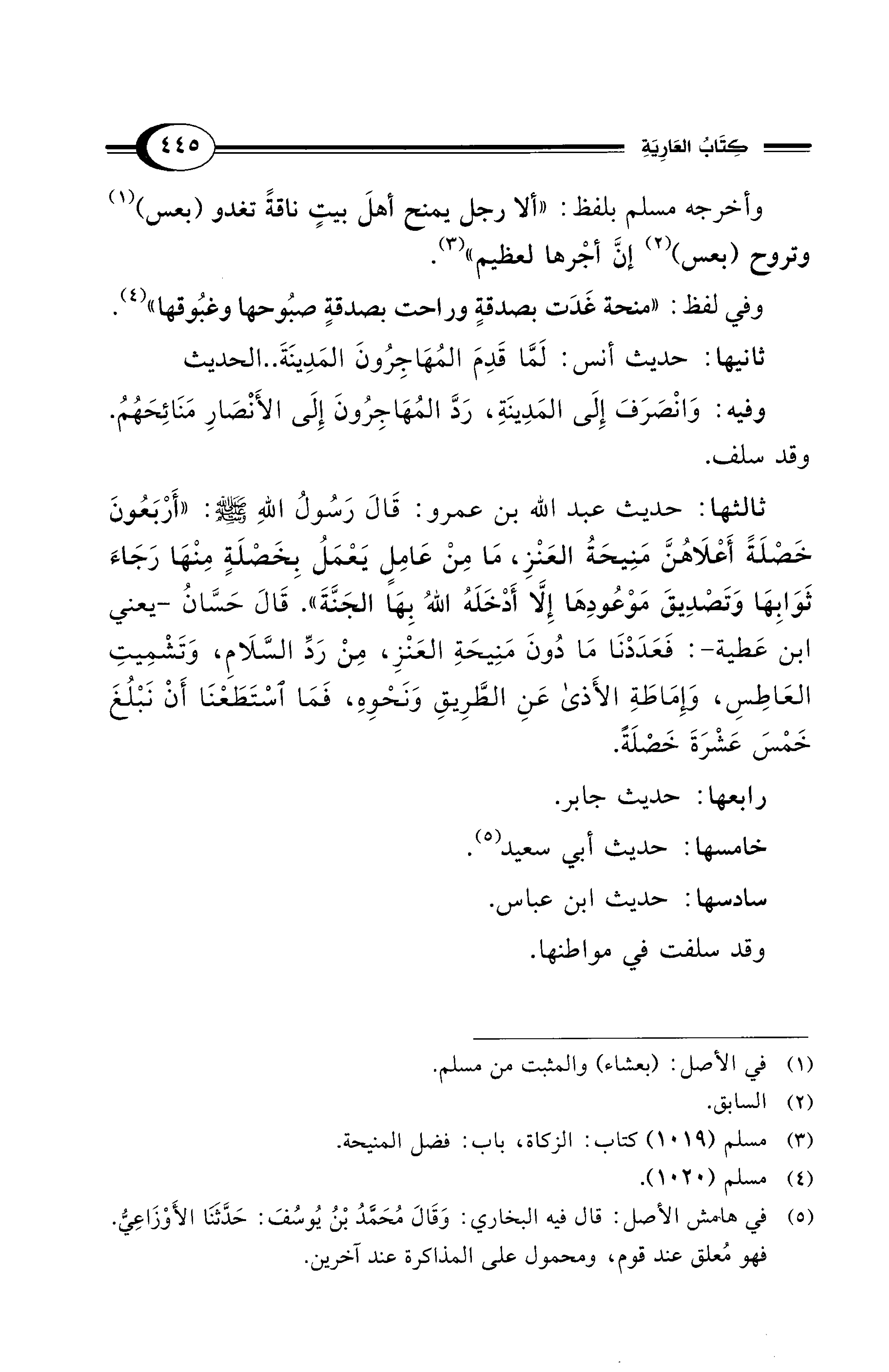 ثالثها: حديث عبد الله بن عمرو: قَالَ رَسُولُ اللهِ - صلى الله عليه وسلم -: "أَرْبَعُونَ خَصْلَةً أَعْلَاهُنَّ مَنِيحَةُ العَنْزِ، مَا مِنْ عَامِلٍ يَعْمَلُ بِخَصْلَةٍ مِنْهَا رَجَاءَ ثَوَابِهَا وَتَصْدِيقَ مَوْعُودِهَا إِلَّا أَدْخَلَهُ اللهُ بِهَا الجَنَّةَ". قَالَ حَسَّانُ -يعني ابن عَطية-: فَعَدَدْنَا مَا دُونَ مَنِيحَةِ العَنْزِ، مِنْ رَدِّ السَّلَامِ، وَتَشْمِيتِ العَاطِسِ، وَإِمَاطَةِ الأَذى عَنِ الطَّرِيقِ وَنَحْوِهِ، فَمَا اسْتَطَعْنَا أَنْ نَبْلُغَ خَمْسَ عَشْرَةَ خَصْلَةً.