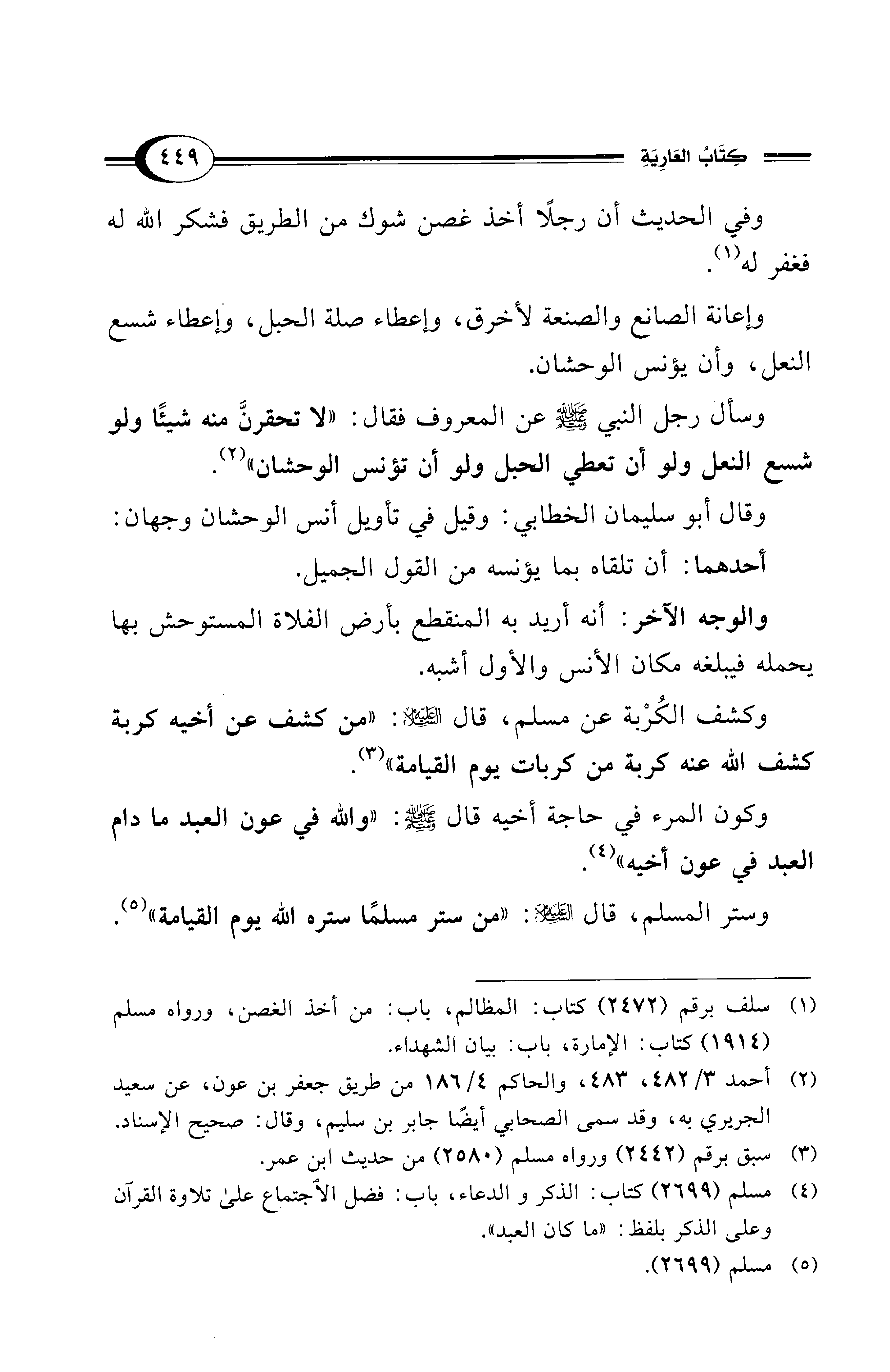 وكشف الكُرْبة عن مسلم، قال - عليه السلام -: "من كشف عن أخيه كربة كشف الله عنه كربة من كربات يوم القيامة" (¬3).