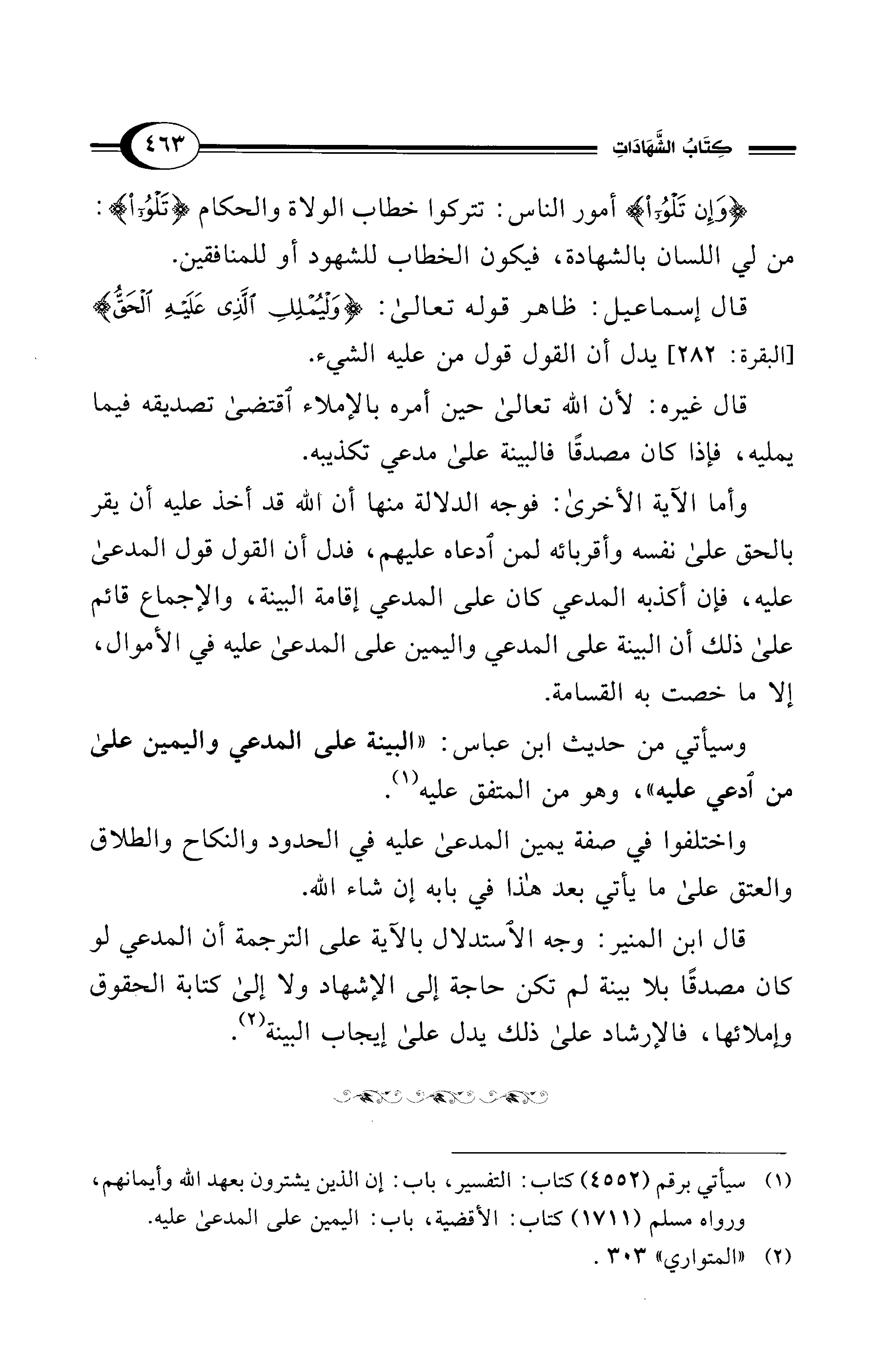 قال ابن المنير: وجه الاستدلال بالآية على الترجمة أن المدعي لو كان مصدقًا بلا بينة لم تكن حاجة إلى الإشهاد ولا إلى كتابة الحقوق وإملائها، فالإرشاد على ذلك يدل على إيجاب البينة (¬2).