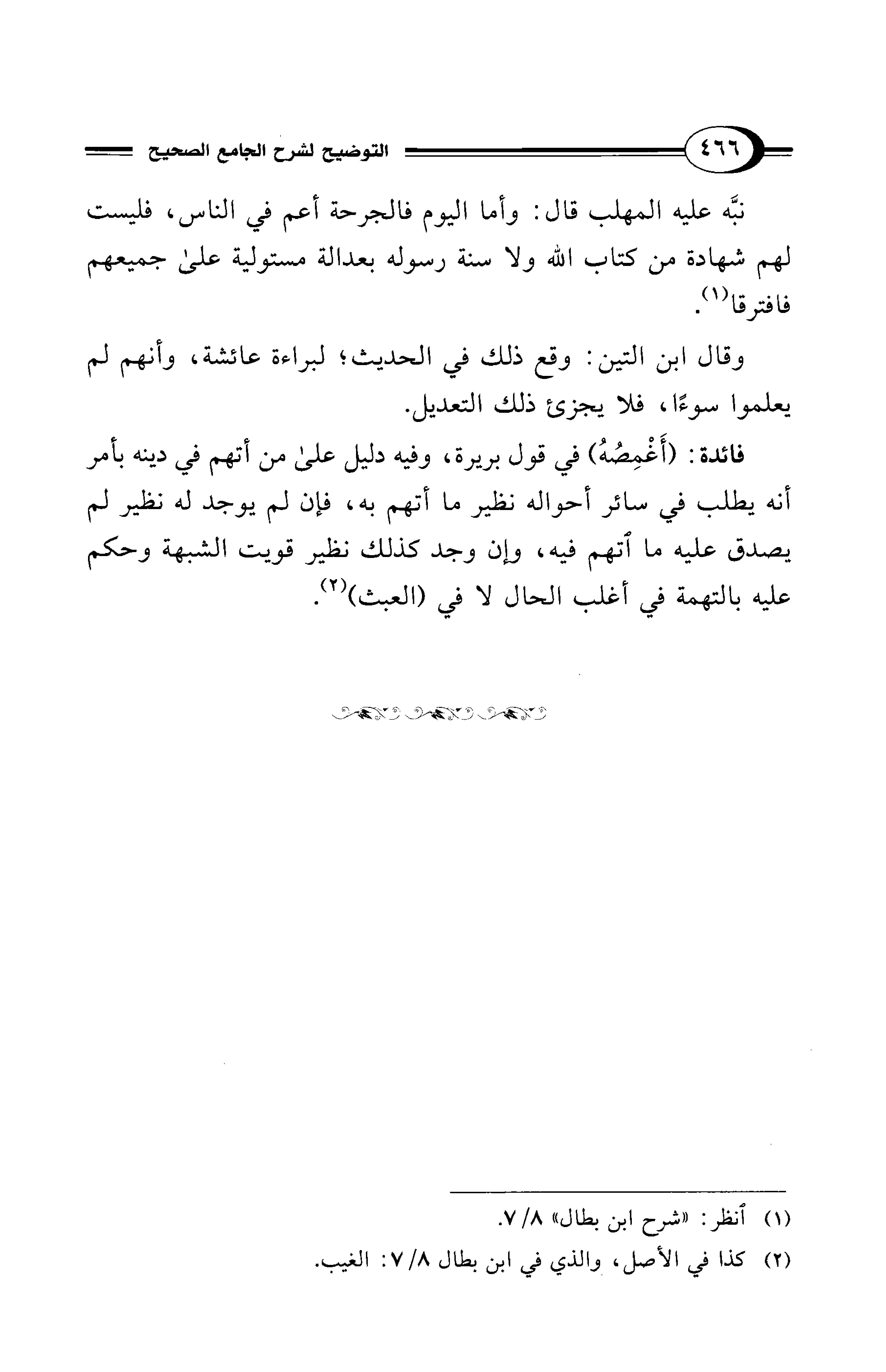 نبَّه عليه المهلب قال: وأما اليوم فالجرحة أعم في الناس، فليست لهم شهادة من كتاب الله ولا سنة رسوله بعدالة مستولية على جميعهم فافترقا (¬1).