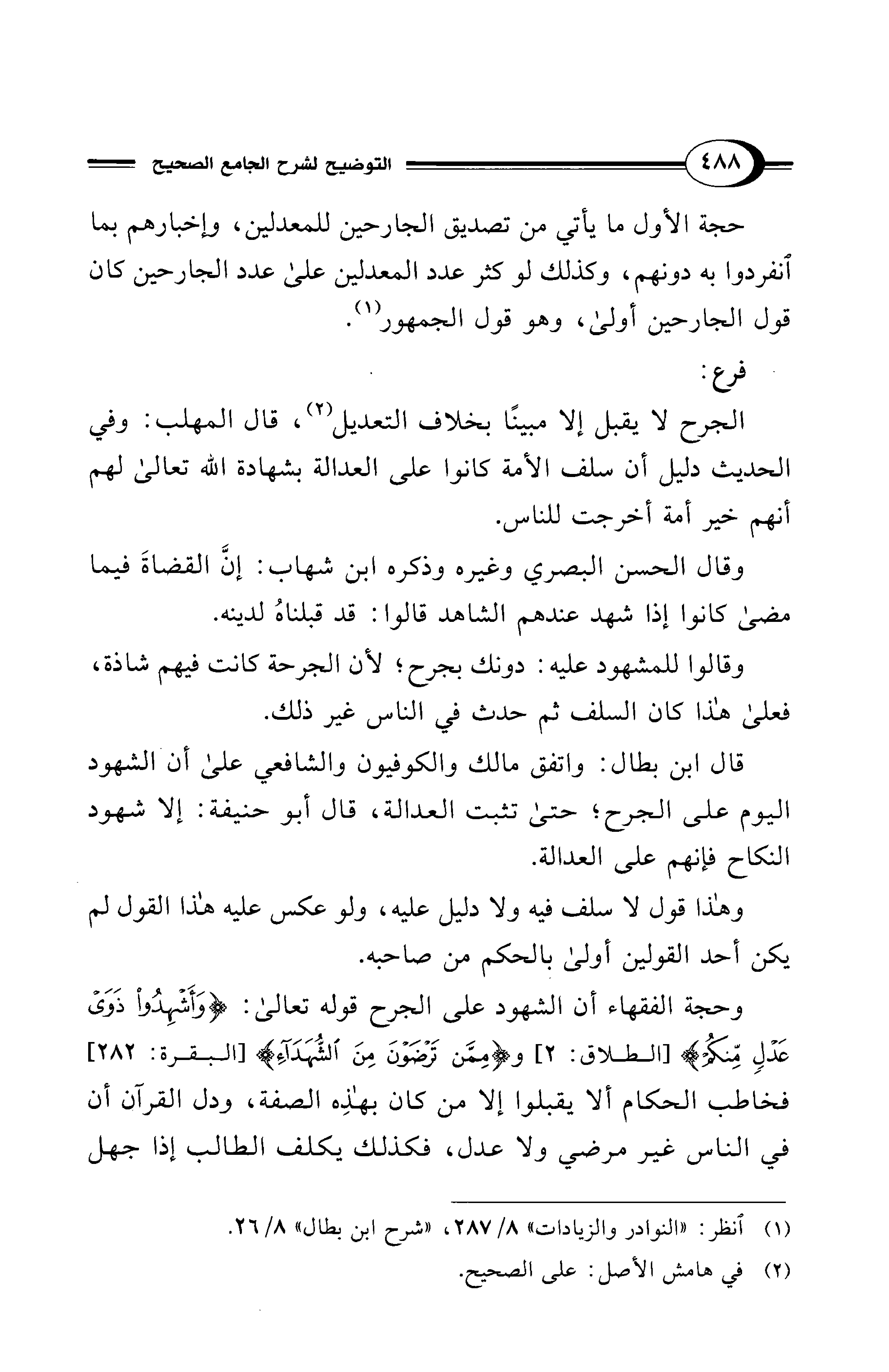 وحجة الفقهاء أن الشهود على الجرح قوله تعالى: {وَأَشْهِدُوا ذَوَيْ عَدْلٍ مِنْكُمْ} [الطلاق: 2] و {مِمَّنْ تَرْضَوْنَ مِنَ الشُّهَدَاءِ} [البقرة: 282] فخاطب الحكام ألا يقبلوا إلا من كان بهذِه الصفة، ودل القرآن أن في الناس غير مرضي ولا عدل، فكذلك يكلف الطالب إذا جهل