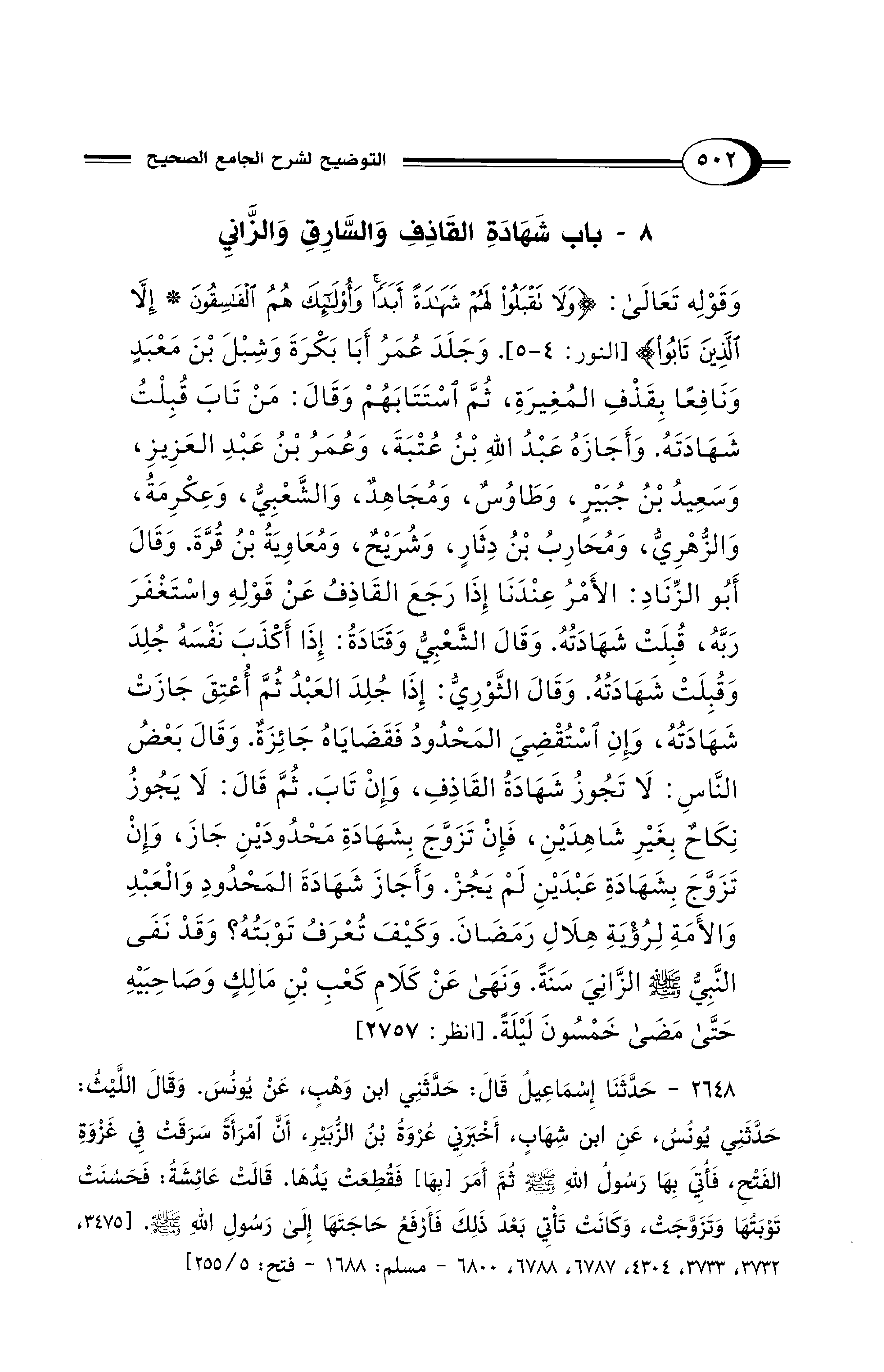 وَقَوْلِ اللهِ تَعَالَى: {وَلَا تَقْبَلُوا لَهُمْ شَهَادَةً أَبَدًا وَأُولَئِكَ هُمُ الفَاسِقُونَ * إِلَّا الَّذِينَ تَابُوا} [النور:4 - 5]. وَجَلَدَ عُمَرُ أَبَا بَكْرَةَ وَشِبْلَ بْنَ مَعْبَدٍ وَنَافِعًا بِقَذْفِ المُغِيرَةِ، ثُمَّ اسْتَتَابَهُمْ، وَقَالَ: مَنْ تَابَ قَبِلْتُ شَهَادَتَهُ. وَأَجَازَهُ عَبْدُ اللهِ بْنُ عُتْبَةَ، وَعُمَرُ بْنُ عَبْدِ العَزِيزِ، وَسَعِيدُ بْنُ جُبَيْرٍ، وَطَاوُسٌ، وَمُجَاهِدٌ، وَالشَّعْبِيُّ، وَعِكْرِمَةُ، وَالزُّهْرِيُّ، وَمُحَارِبُ بْنُ دِثَارٍ، وَشُرَيْحٌ، وَمُعَاوِيَةُ بْنُ قُرَّةَ. وَقَالَ أَبُو الزِّنَادِ: الأَمْرُ عِنْدَنَا بِالمَدِينَةِ إِذَا رَجَعَ القَاذِفُ عَنْ قَوْلِهِ اسْتَغْفَرَ رَبَّهُ، قُبِلَتْ شَهَادَتُهُ. وَقَالَ الشَّعْبِيُّ وَقَتَادَةُ: إِذَا أَكْذَبَ نَفْسَهُ جُلِدَ وَقُبِلَتْ شَهَادَتُهُ. وَقَالَ الثَّوْرِيُّ: إِذَا جُلِدَ العَبْدُ ثُمَّ أُعْتِقَ جَازَتْ شَهَادَتُهُ، وَإِنِ اسْتُقْضِيَ المَحْدُودُ فَقَضَايَاهُ جَائِزَةٌ. وَقَالَ بَعْضُ النَّاسِ: لَا تَجُوزُ شَهَادَةُ القَاذِفِ، وَإِنْ تَابَ، ثُمَّ قَالَ: لَا يَجُوزُ نِكَاحٌ بِغَيْرِ شَاهِدَيْنِ، فَإِنْ تَزَوَّجَ بِشَهَادَةِ مَحْدُودَيْنِ جَازَ، وَإِنْ تَزَوَّجَ بِشَهَادَةِ عَبْدَيْنِ لَمْ يَجُزْ. وَأَجَازَ شَهَادَةَ المَحْدُودِ وَالعَبْدِ وَالأَمَةِ لِرُؤْيَةِ هِلاَلِ رَمَضَانَ. وَكَيْفَ تُعْرَفُ تَوْبَتُهُ؟ وَقَدْ نَفَى النَّبِيُّ - صلى الله عليه وسلم - الزَّانِيَ سَنَةً. وَنَهَى عَنْ كَلاَمِ كَعْبِ بْنِ مَالِكٍ وَصَاحِبَيْهِ حَتَّى مَضَى خَمْسُونَ لَيْلَةً. [انظر: 2757]