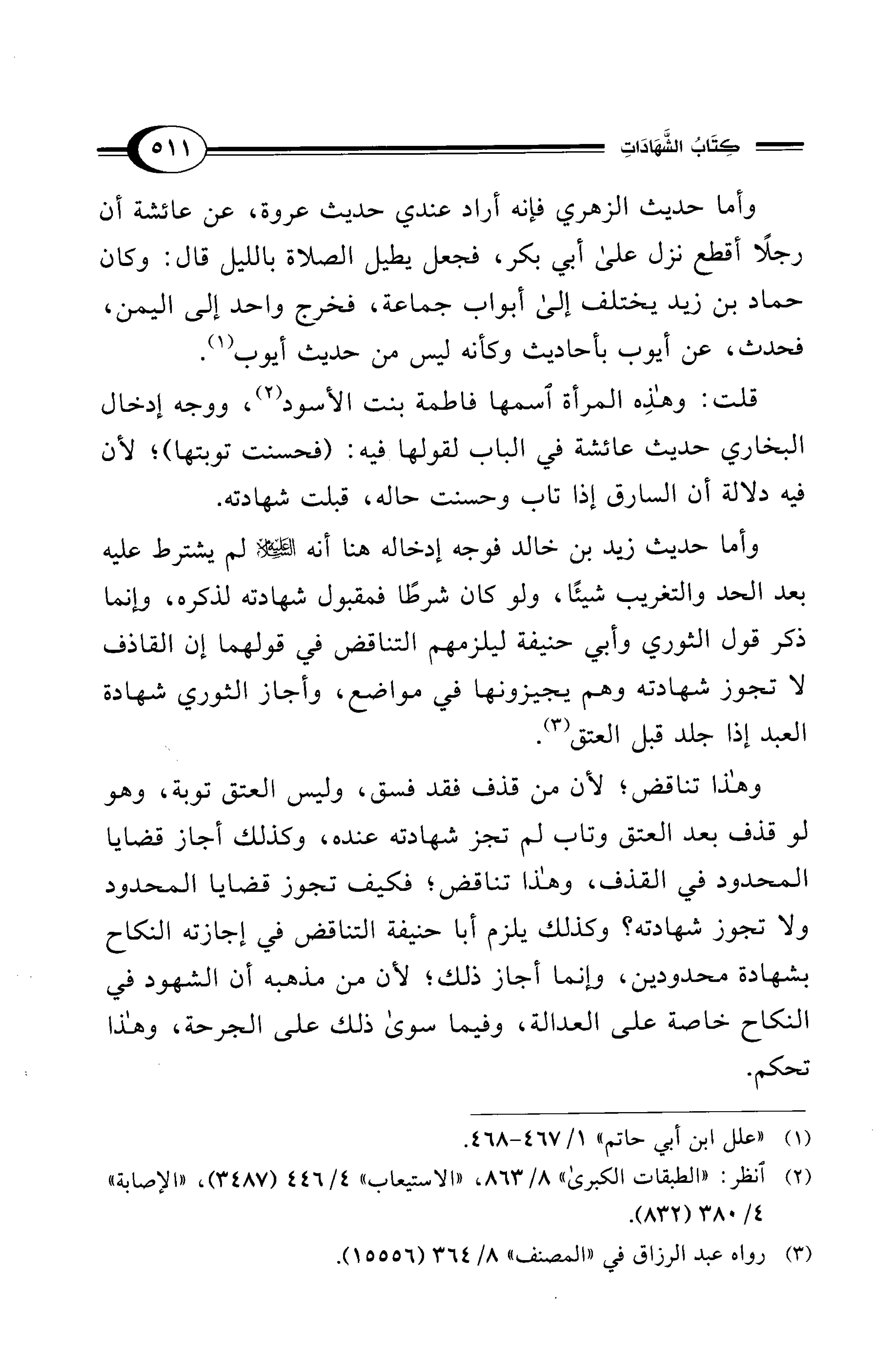 وأما حديث الزهري فإنه أراد عندي حديث عروة، عن عائشة أن رجلًا أقطع نزل على أبي بكر، فجعل يطيل الصلاة بالليل قال: وكان حماد بن زيد يختلف إلى أبواب جماعة، فخرج واحد إلى اليمن،