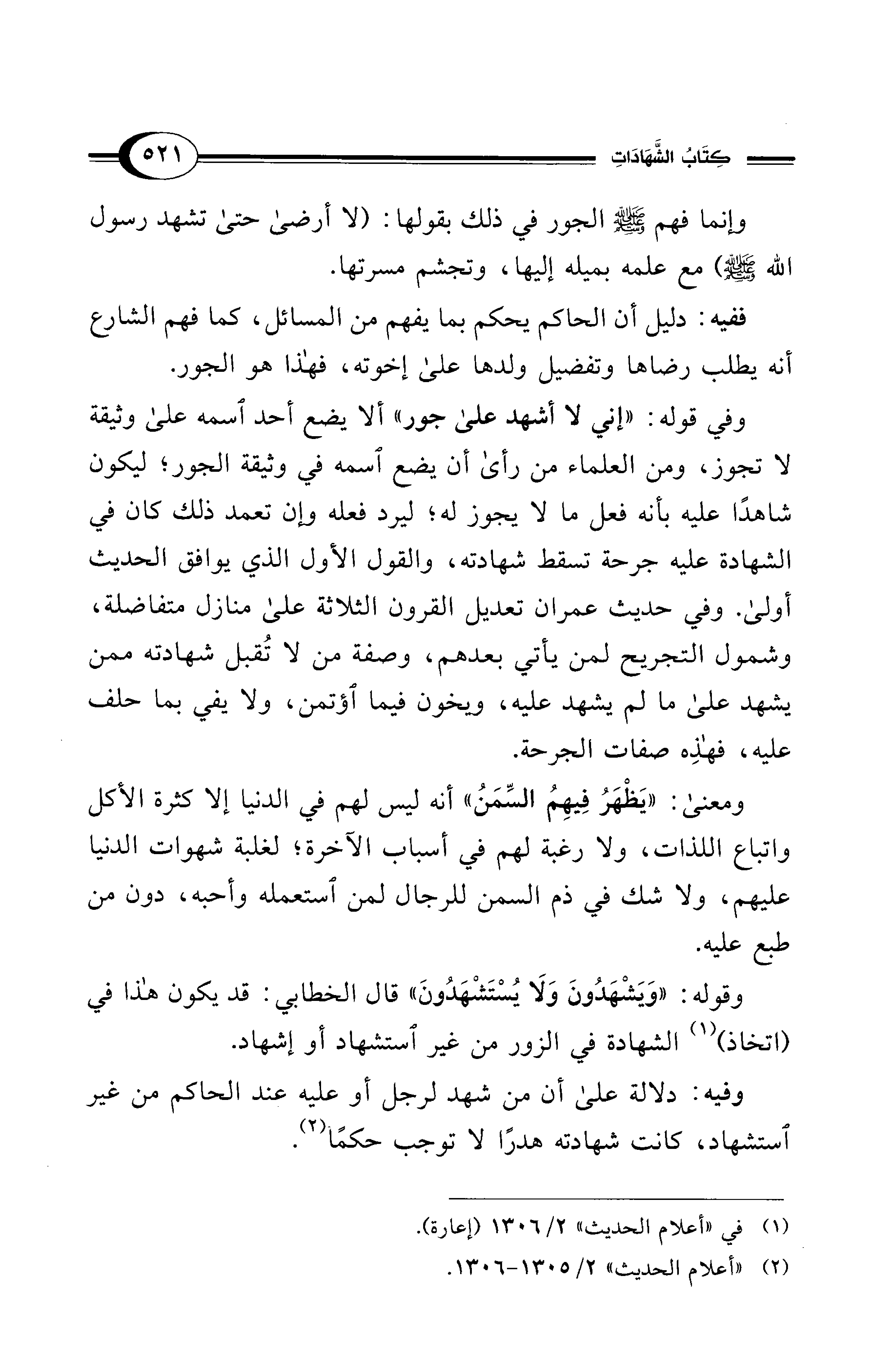 وفي قوله: "إني لا أشهد على جور" ألا يضع أحد اسمه على وثيقة لا تجوز، ومن العلماء من رأى أن يضع اسمه في وثيقة الجور؛ ليكون شاهدًا عليه بأنه فعل ما لا يجوز له؛ ليرد فعله وإن تعمد ذلك كان في الشهادة عليه جرحة تسقط شهادته، والقول الأول الذي يوافق الحديث أولى. وفي حديث عمران تعديل القرون الثلاثة على منازل متفاضلة، وشمول التجريح لمن يأتي بعدهم، وصفة من لا تُقبل شهادته ممن يشهد على ما لم يشهد عليه، ويخون فيما اؤتمن، ولا يفي بما حلف عليه، فهذِه صفات الجرحة.