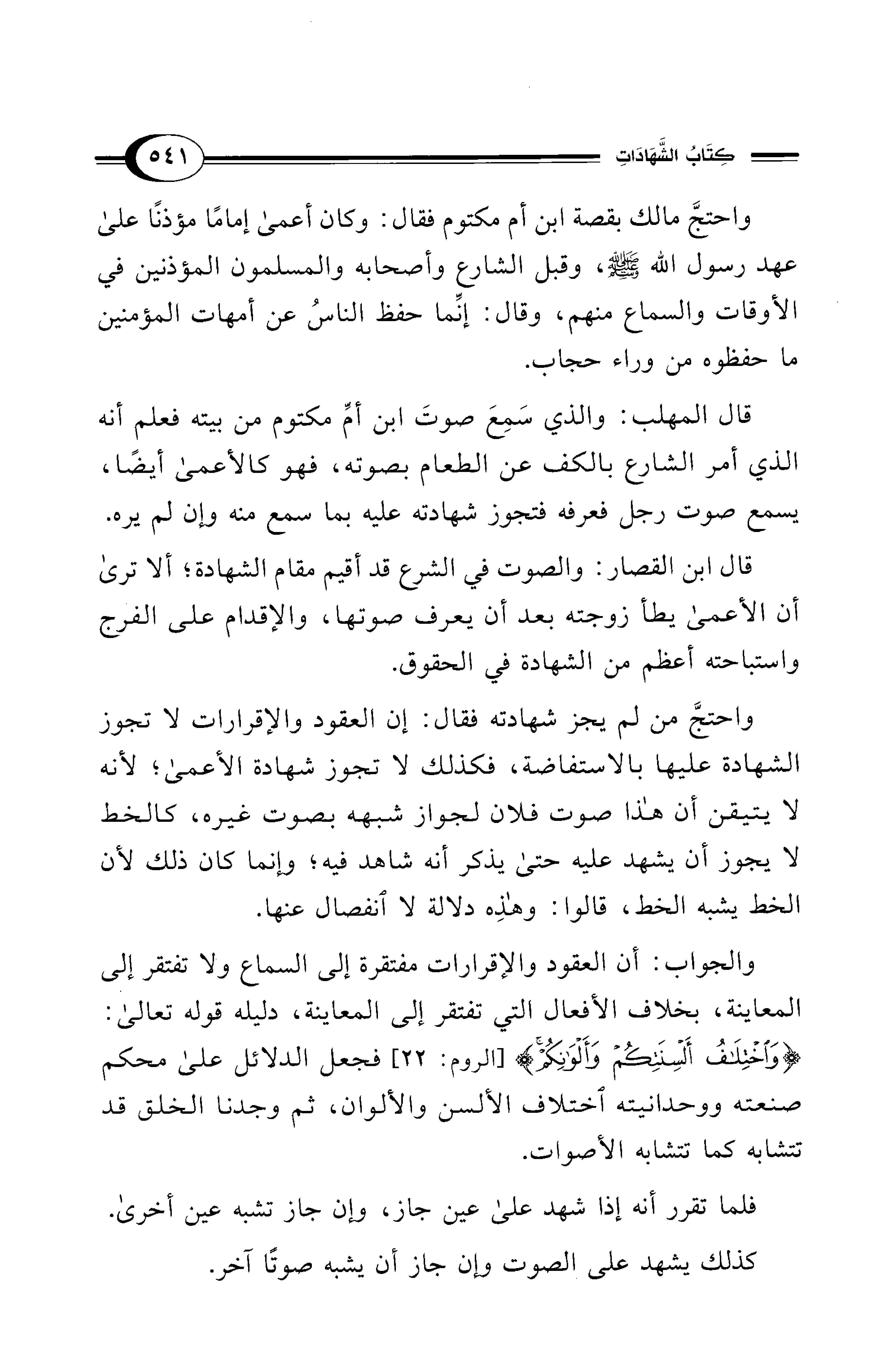 الشهادة عليها بالاستفاضة، فكذلك لا تجوز شهادة الأعمى؛ لأنه لا يتيقن أن هذا صوت فلان لجواز شبهه بصوت غيره، كالخط لا يجوز أن يشهد عليه حتى يذكر أنه شاهد فيه؛ وإنما كان ذلك لأن الخط يشبه الخط، قالوا: وهذِه دلالة لا انفصال عنها.
