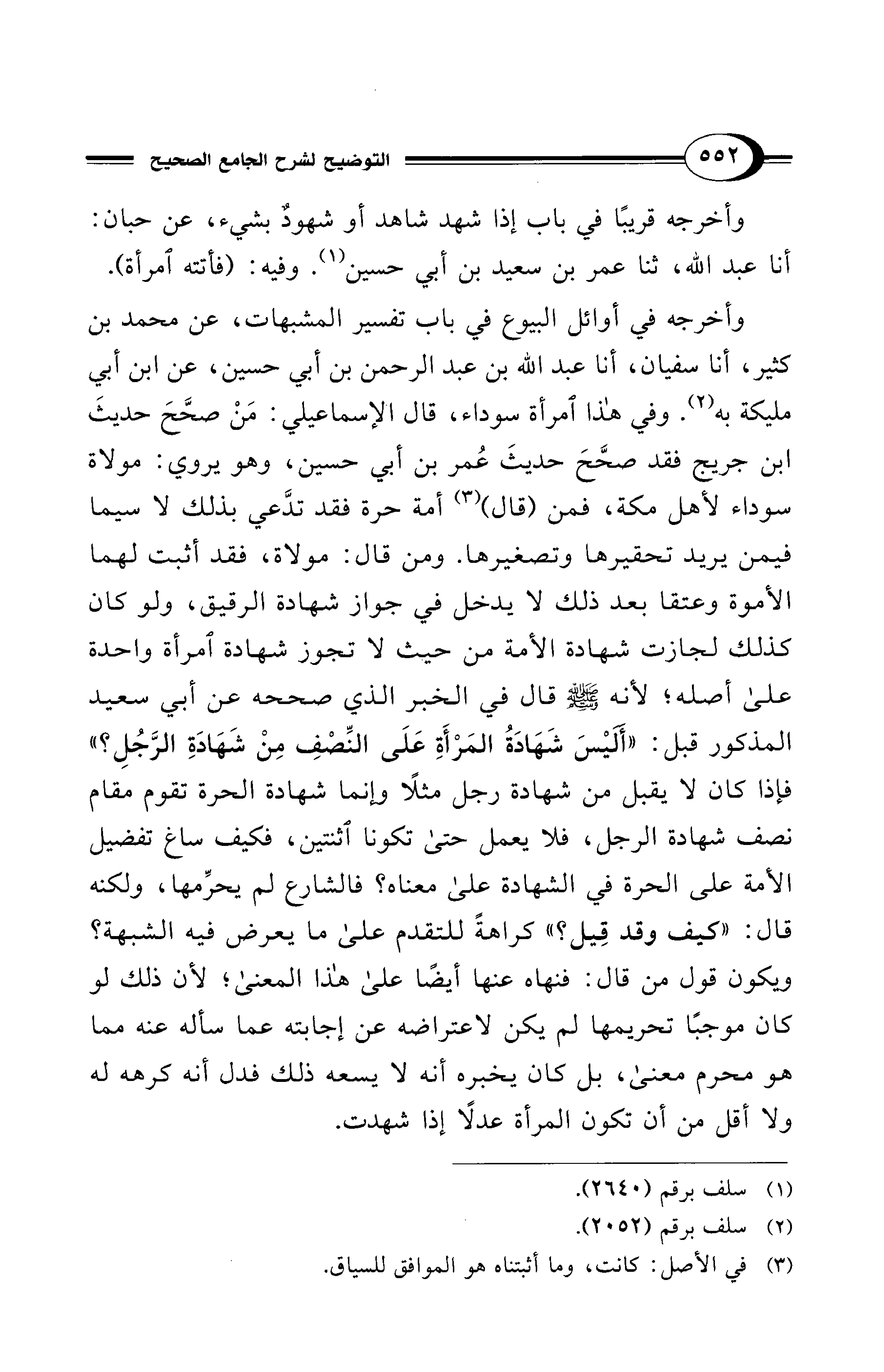 وأخرجه في أوائل البيوع في باب تفسير المشبهات، عن محمد بن كثير، أنا سفيان، أنا عبد الله بن عبد الرحمن بن أبي حسين، عن ابن أبي مليكة به (¬2). وفي هذا امرأة سوداء، قال الإسماعيلي: مَنْ صحَّحَ حديثَ ابن جريج فقد صحَّحَ حديثَ عُمر بن أبي حسين، وهو يروي: مولاة سوداء لأهل مكة، فمن (قال) (¬3) أمة حرة فقد تدَّعي بذلك لا سيما فيمن يريد تحقيرها وتصغيرها. ومن قال: مولاة، فقد أثبت لهما الأموة وعتقا بعد ذلك لا يدخل في جواز شهادة الرقيق، ولو كان كذلك لجازت شهادة الأمة من حيث لا تجوز شهادة امرأة واحدة على أصله؛ لأنه - صلى الله عليه وسلم - قال في الخبر الذي صححه عن أبي سعيد المذكور قبل: "أَليْسَ شَهَادَةُ المَرْأَةِ عَلَى النِّصْفِ مِنْ شَهَادَةِ الرَّجُلِ؟ " فإذا كان لا يقبل من شهادة رجل مثلًا وإنما شهادة الحرة تقوم مقام نصف شهادة الرجل، فلا يعمل حتى تكونا اثنتين، فكيف ساغ تفضيل الأمة على الحرة في الشهادة على معناه؟ فالشارع لم يحرِّمها، ولكنه قال: "كيف وقد قِيل؟ " كراهةً للتقدم على ما يعرض فيه الشبهة؟ ويكون قول من قال: فنهاه عنها أيضًا على هذا المعنى؛ لأن ذلك لو كان موجبًا تحريمها لم يكن لاعتراضه عن إجابته عما سأله عنه مما هو محرم معنى، بل كان يخبره أنه لا يسعه ذلك فدل أنه كرهه له ولا أقل من أن تكون المرأة عدلًا إذا شهدت.