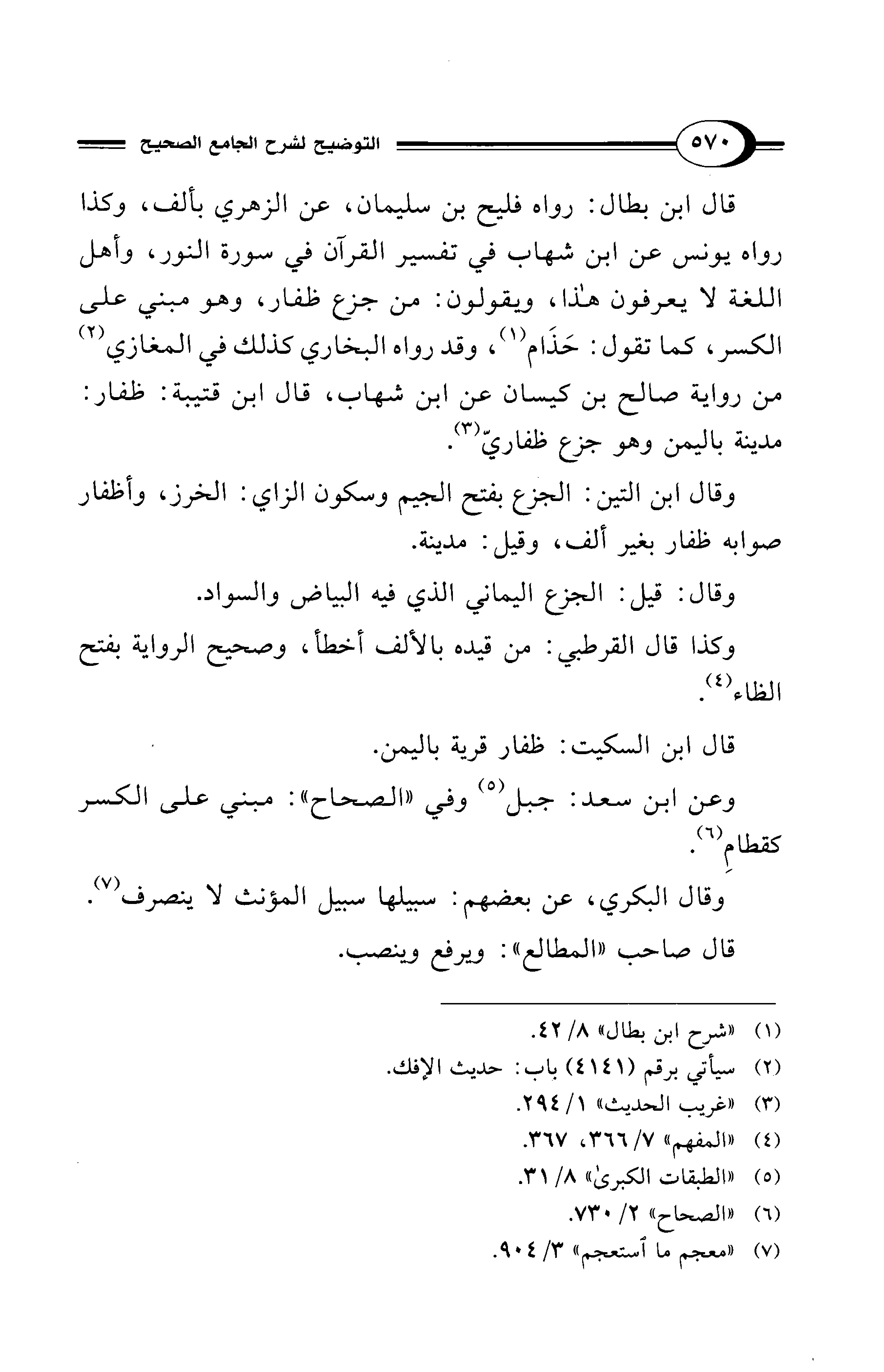 قال ابن بطال: رواه فليح بن سليمان، عن الزهري بألف، وكذا رواه يونس عن ابن شهاب في تفسير القرآن في سورة النور، وأهل اللغة لا يعرفون هذا، ويقولون: من جزع ظفار، وهو مبني على الكسر، كما تقول: حَذَام (¬1)، وقد رواه البخاري كذلك في المغازي (¬2) من رواية صالح بن كيسان عن ابن شهاب، قال ابن قتيبة: ظفار: مدينة باليمن وهو جزع ظفاريّ (¬3).