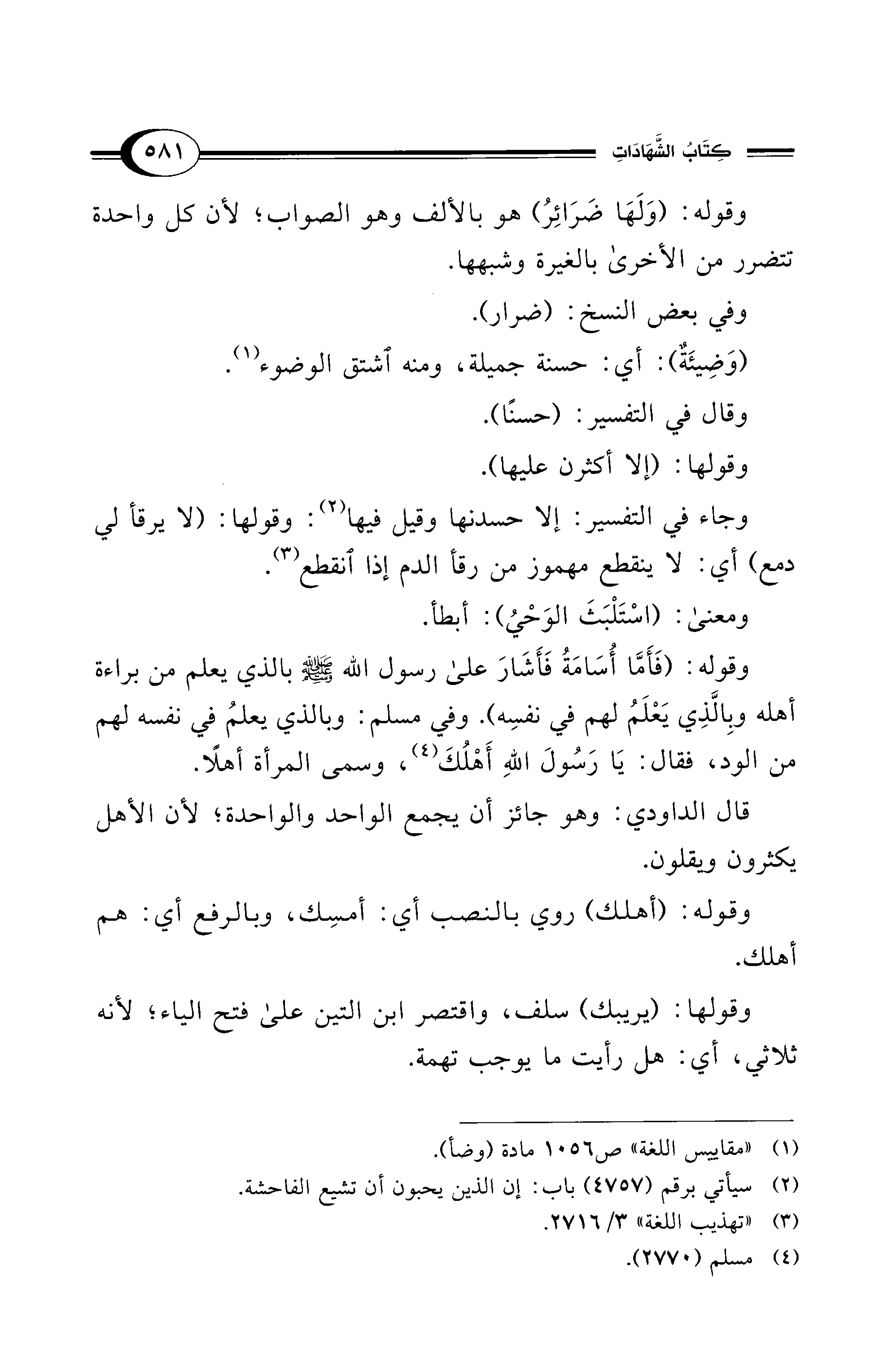 وقوله: (وَلَهَا ضَرَائِرُ) هو بالألف وهو الصواب؛ لأن كل واحدة تتضرر من الأخرى بالغيرة وشبهها.