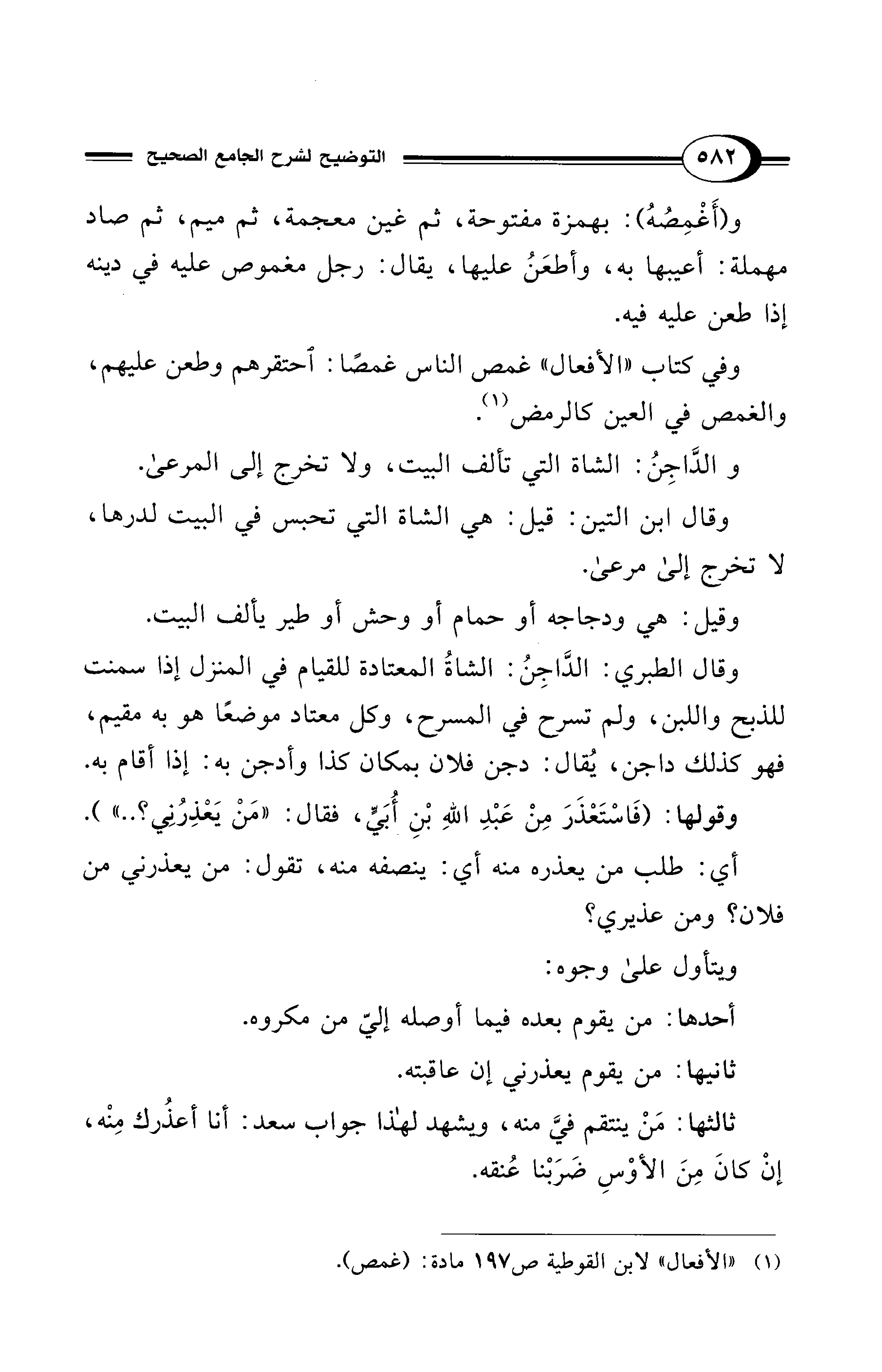وقال الطبري: الدَّاجِنُ: الشاةُ المعتادة للقيام في المنزل إذا سمنت للذبح واللبن، ولم تسرح في المسرح، وكل معتاد موضعًا هو به مقيم، فهو كذلك داجن، يُقال: دجن فلان بمكان كذا وأدجن به: إذا أقام به.