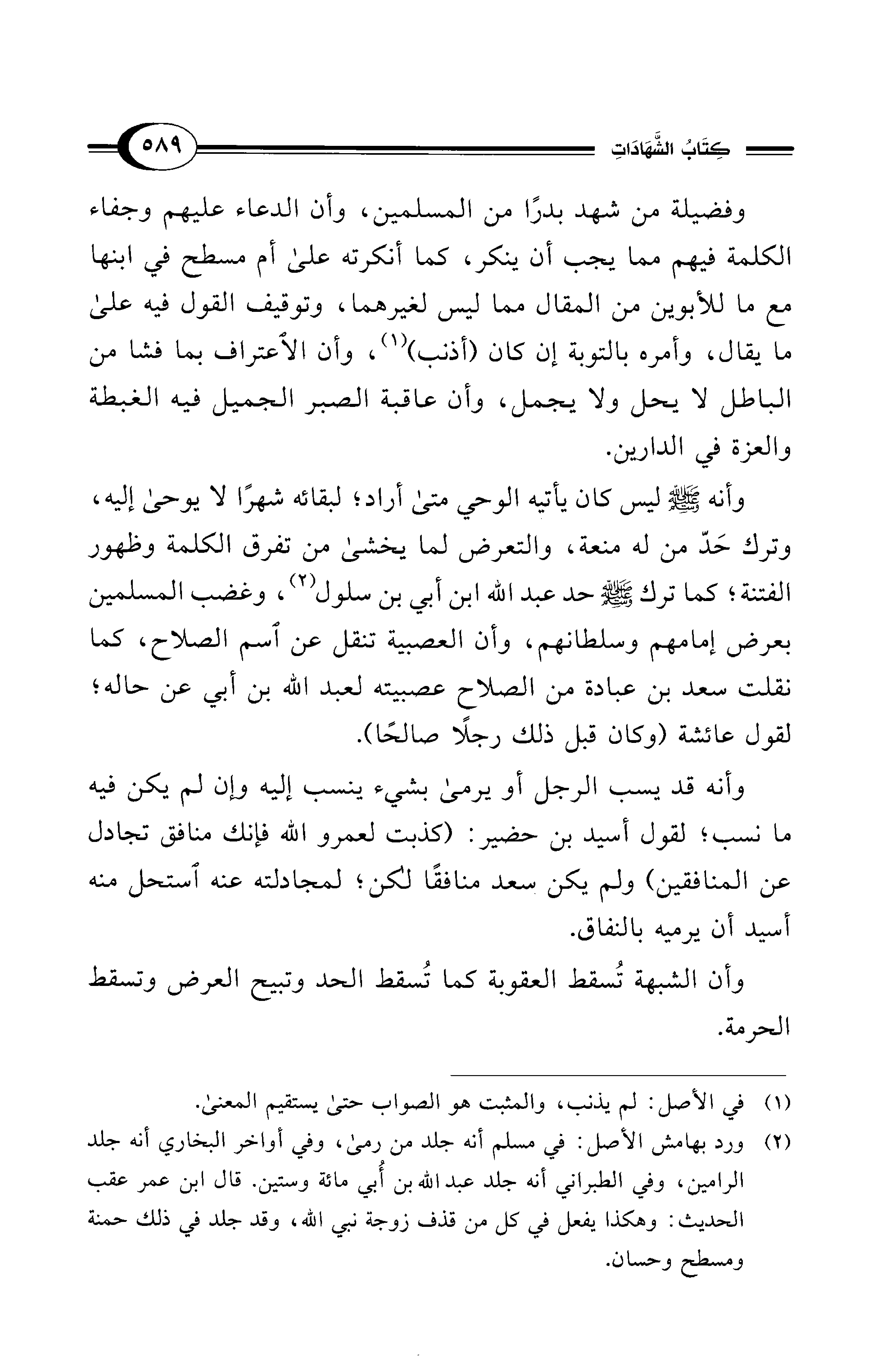 وأنه - صلى الله عليه وسلم - ليس كان يأتيه الوحي متى أراد؛ لبقائه شهرًا لا يوحى إليه، وترك حَدّ من له منعة، والتعرض لما يخشى من تفرق الكلمة وظهور الفتنة، كما ترك - صلى الله عليه وسلم - حد عبد الله ابن أبي بن سلول (¬2)، وغضب المسلمين بعرض إمامهم وسلطانهم، وأن العصبية تنقل عن اسم الصلاح، كما نقلت سعد بن عبادة من الصلاح عصبيته لعبد الله بن أبي عن حاله؛ لقول عائشة (وكان قبل ذلك رجلًا صالحًا).