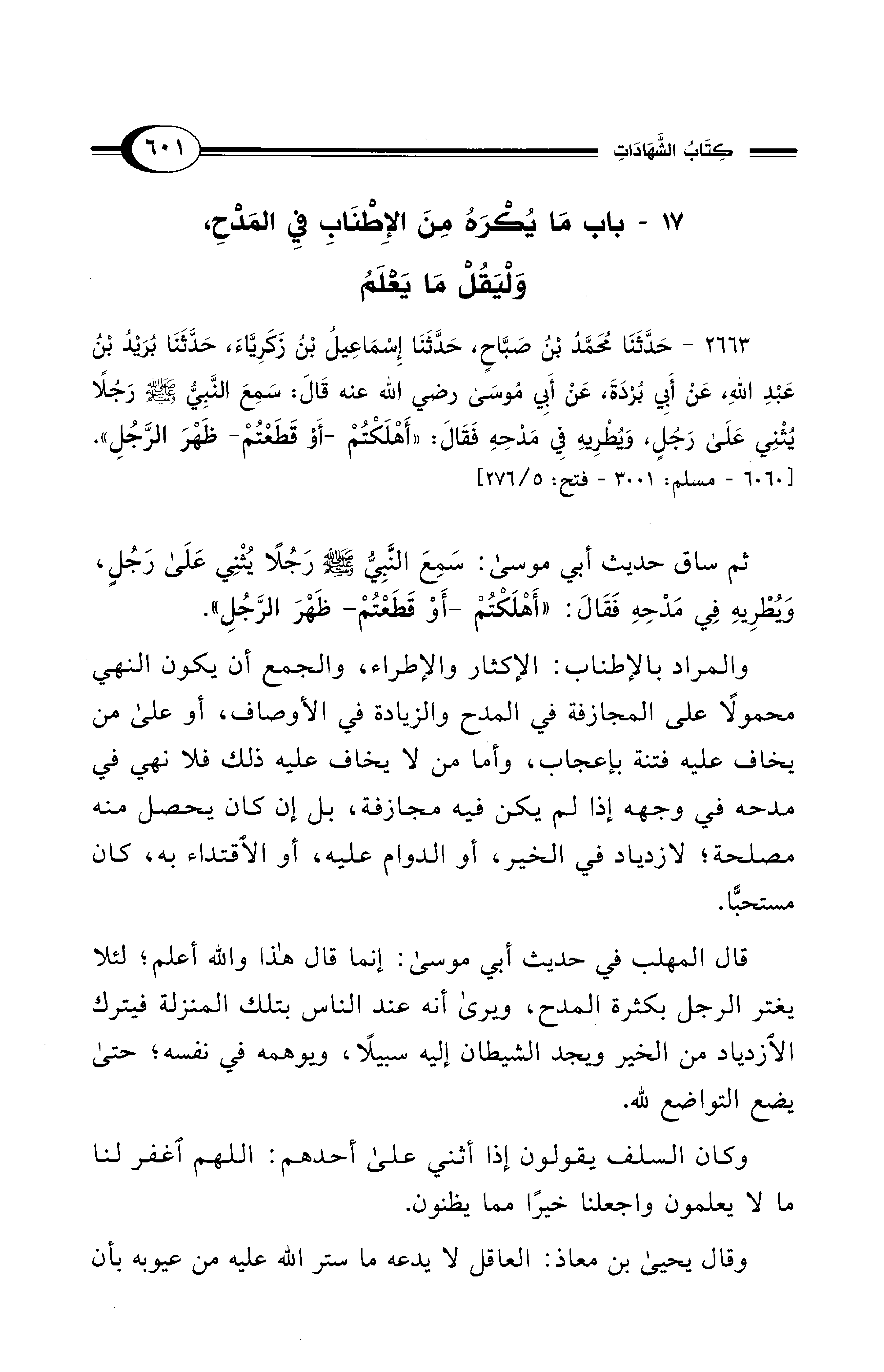 ثم ساق حديث أبي موسى: سَمِعَ النَّبِيُّ - صلى الله عليه وسلم - رَجُلًا يُثْنِي عَلَى رَجُلٍ، وَيُطْرِيهِ فِي مَدْحِهِ فَقَالَ: "أَهْلَكْتُمْ -أَوْ قَطَعْتُمْ- ظَهْرَ الرَّجُلِ".