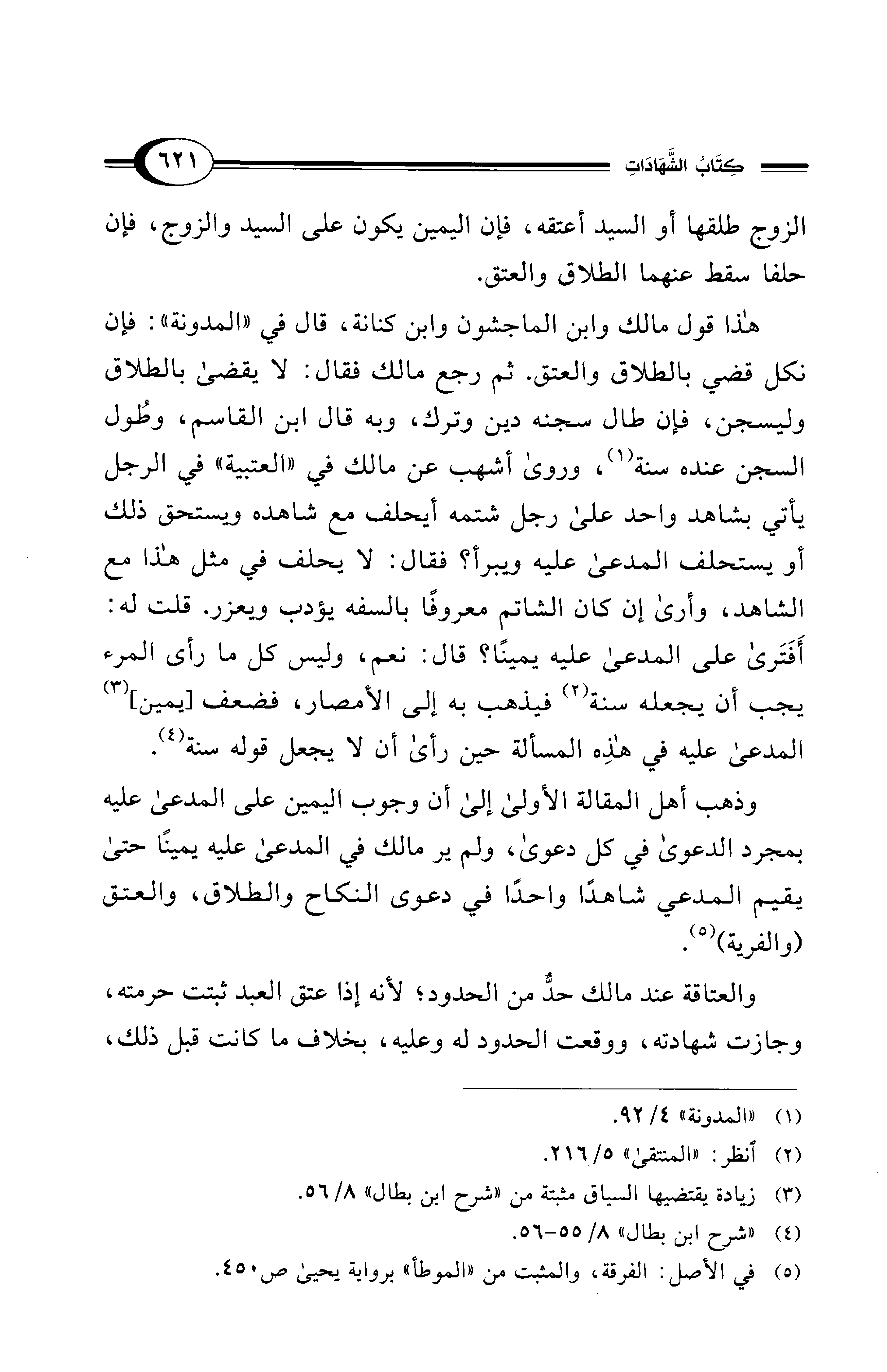 وذهب أهل المقالة الأولى إلى أن وجوب اليمين على المدعى عليه بمجرد الدعوى في كل دعوى، ولم ير مالك في المدعى عليه يمينًا حتى يقيم المدعي شاهدًا واحدًا في دعوى النكاح والطلاق، والعتق (والفرية) (¬5).