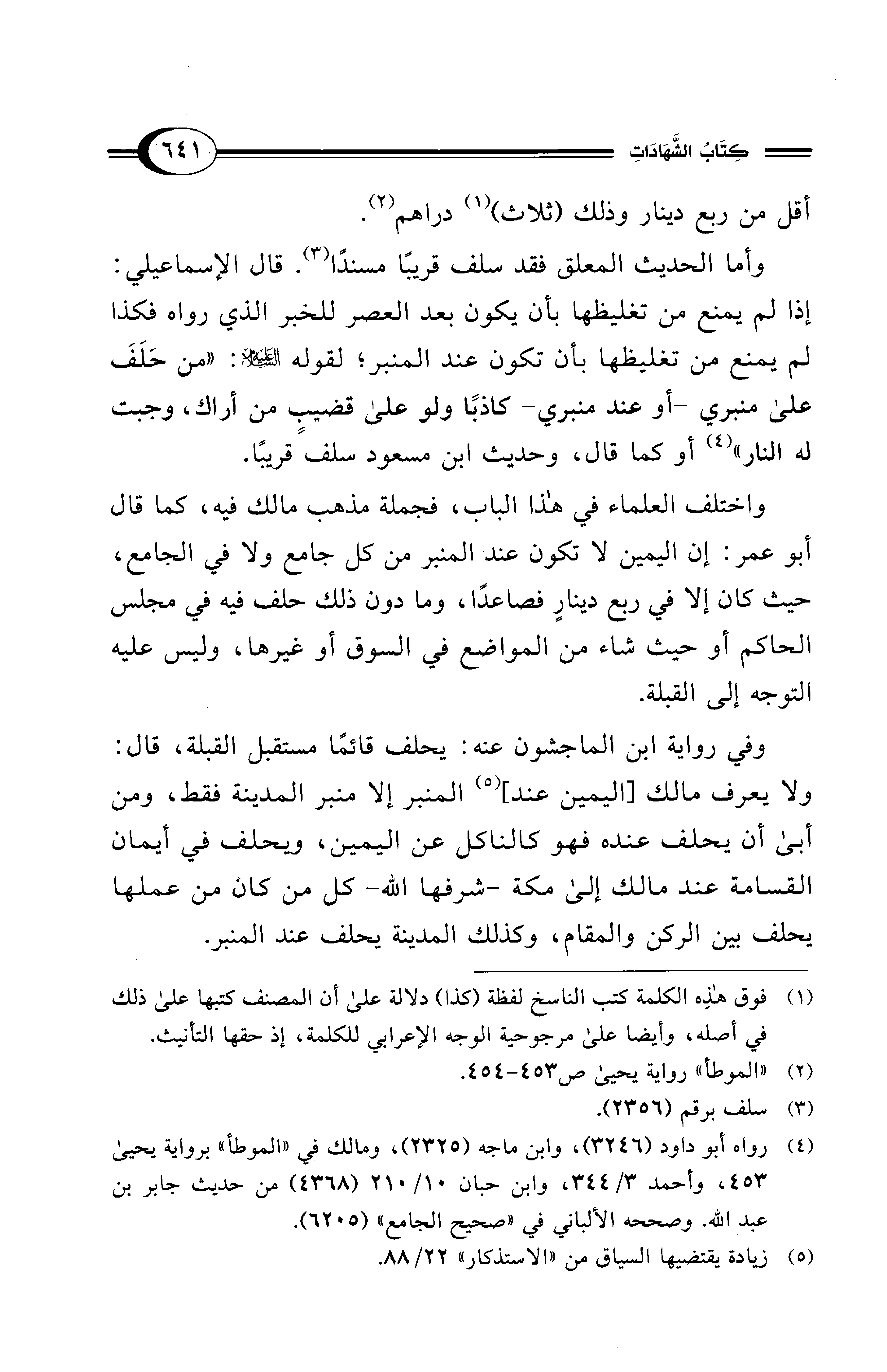 واختلف العلماء في هذا الباب، فجملة مذهب مالك فيه، كما قال أبو عمر: إن اليمين لا تكون عند المنبر من كل جامع ولا في الجامع، حيث كان إلا في ربع دينارٍ فصاعدًا، وما دون ذلك حلف فيه في مجلس الحاكم أو حيث شاء من المواضع في السوق أو غيرها، وليس عليه التوجه إلى القبلة.