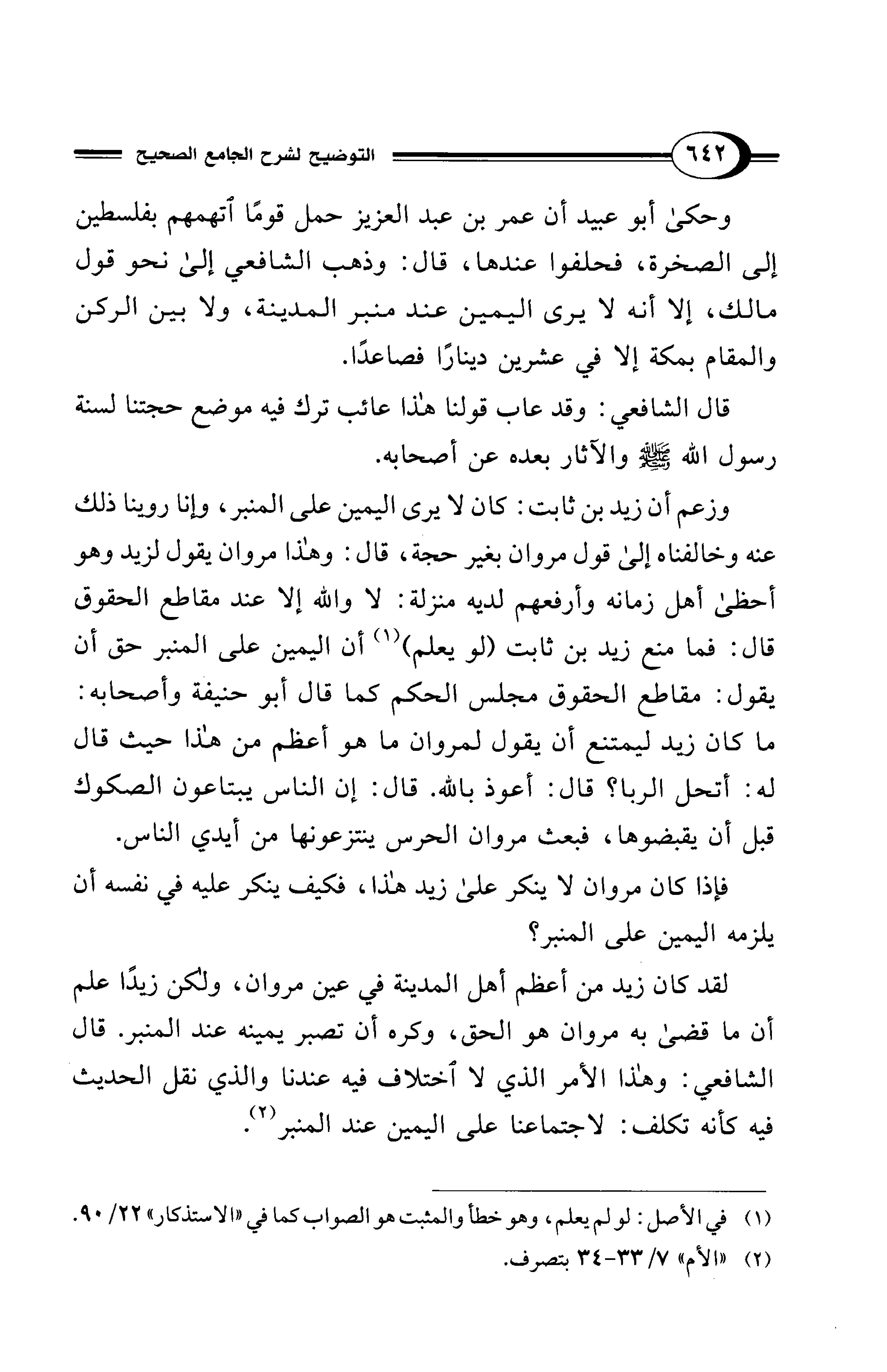 لقد كان زيد من أعظم أهل المدينة في عين مروان، ولكن زيدًا علم أن ما قضى به مروان هو الحق، وكره أن تصبر يمينه عند المنبر. قال الشافعي: وهذا الأمر الذي لا اختلاف فيه عندنا والذي نقل الحديث فيه كأنه تكلف: لاجتماعنا على اليمين عند المنبر (¬2).