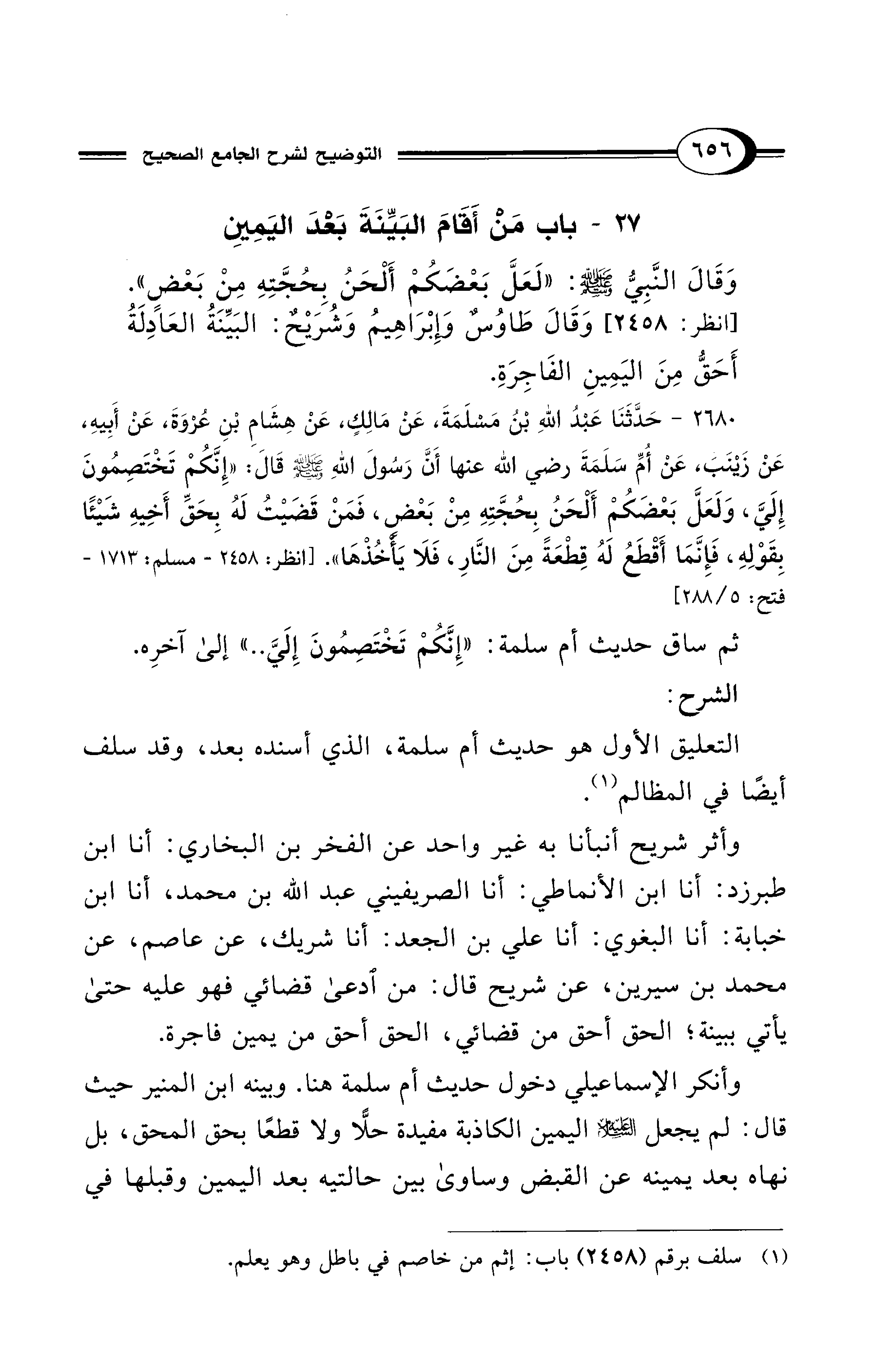 ثم ساق حديث أم سلمة: "إِنَّكُمْ تَخْتَصِمُونَ إِلَيَّ .. " إلى آخرِه.