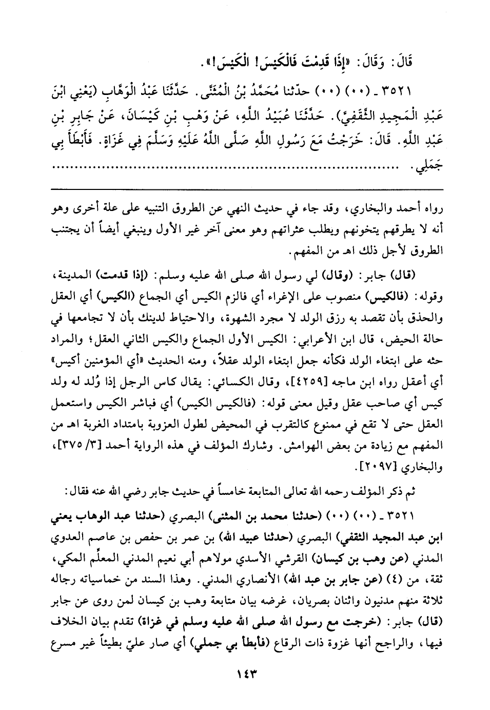 ٣٥٢١ - (٠٠) (٠٠) حدثنا مُحَمدُ بْنُ الْمُثَنى. حَدَّثَنَا عَبْدُ الوَهابِـ (يَعْنِي ابْنَ عَبْدِ الْمَجِيدِ الثقَفِي). حَدَّثَنَا عُبَيدُ اللهِ، عَنْ وَهْبِ بْنِ كَيسَانَ، عَنْ جَابِرِ بنِ عَبْدِ اللهِ. قَال: خَرَجْتُ مَعَ رَسُولِ اللهِ صَلى اللهُ عَلَيهِ وَسَلمَ فِي غَزَاةٍ. فَأبْطَأَ بِي جَمَلِي