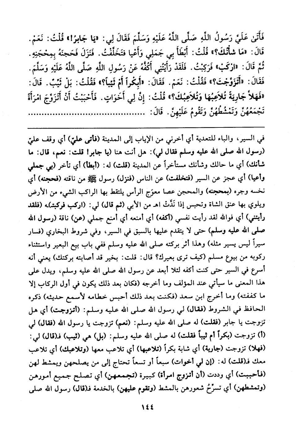 فَأتَى عَلَيَّ رَسُولُ اللهِ صَلى اللهُ عَلَيهِ وَسَلمَ فَقَال لِي: "يَا جَابرُ! " قُلْتُ: نَعَم. قَال: "مَا شأنكَ؟ " قُلتُ: أَبطَأ بِي جَمَلِي وَأَعيا فتَخَلقتُ. فَنَزَلَ فَحَجنَهُ بِمِحجَنِهِ. ثُم قَال: "اركب فَرَكبتُ. فَلَقَدْ رَأَيتُنِي أَكُفُّهُ عَن رَسُولِ اللهِ صَلى اللهُ عَلَيهِ وَسَلمَ. فَقَال: "أتزَوَّجتَ؟ " فَقُلتُ: نَعَمْ. فَقَال: "أَبِكرا أَم ثَيبًا؟ " فَقُلتُ: بَل ثَيبٌ. قَال: "فَهَلا جَارِيَة تُلاعِبُهَا وَتُلاعِبُكَ؟ " قُلتُ: إِن لِي أَخَوَات. فَأحبَبتُ أَن أتزَوجَ امرَأَة تَجمَعُهُن وَتَمشُطُهُن وَتَقُومُ عَلَيهِن. قَال: