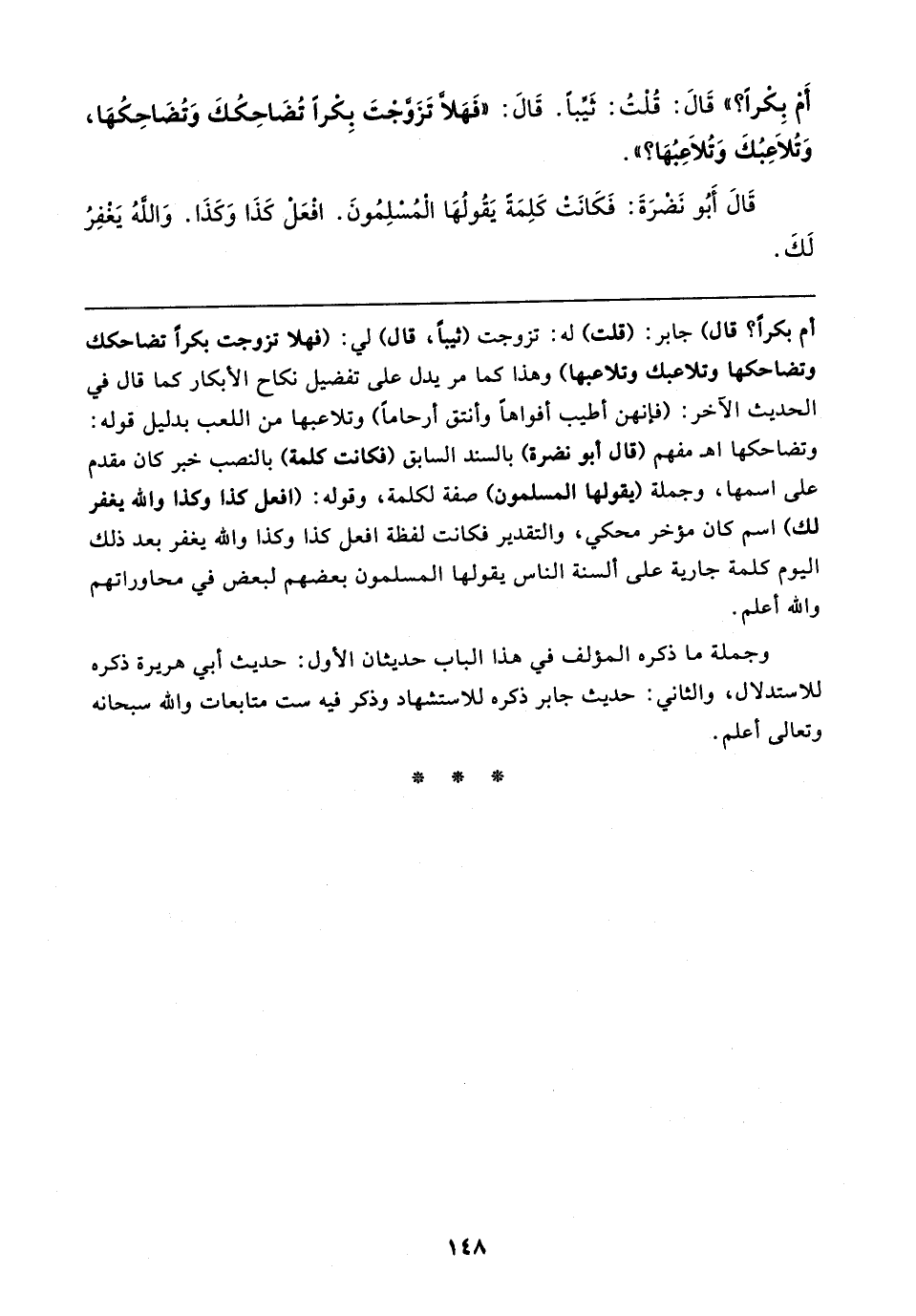 أَم بِكرًا؟ " قَال: قُلْتُ: ثَيِّبًا. قَال: (فَهَلا تَزَوَّجتَ بكرًا تُضَاحِكُكَ وَتُضَاحِكُهَا، وَتُلاعِبُكَ وَتُلاعِبُهَا؟ ".