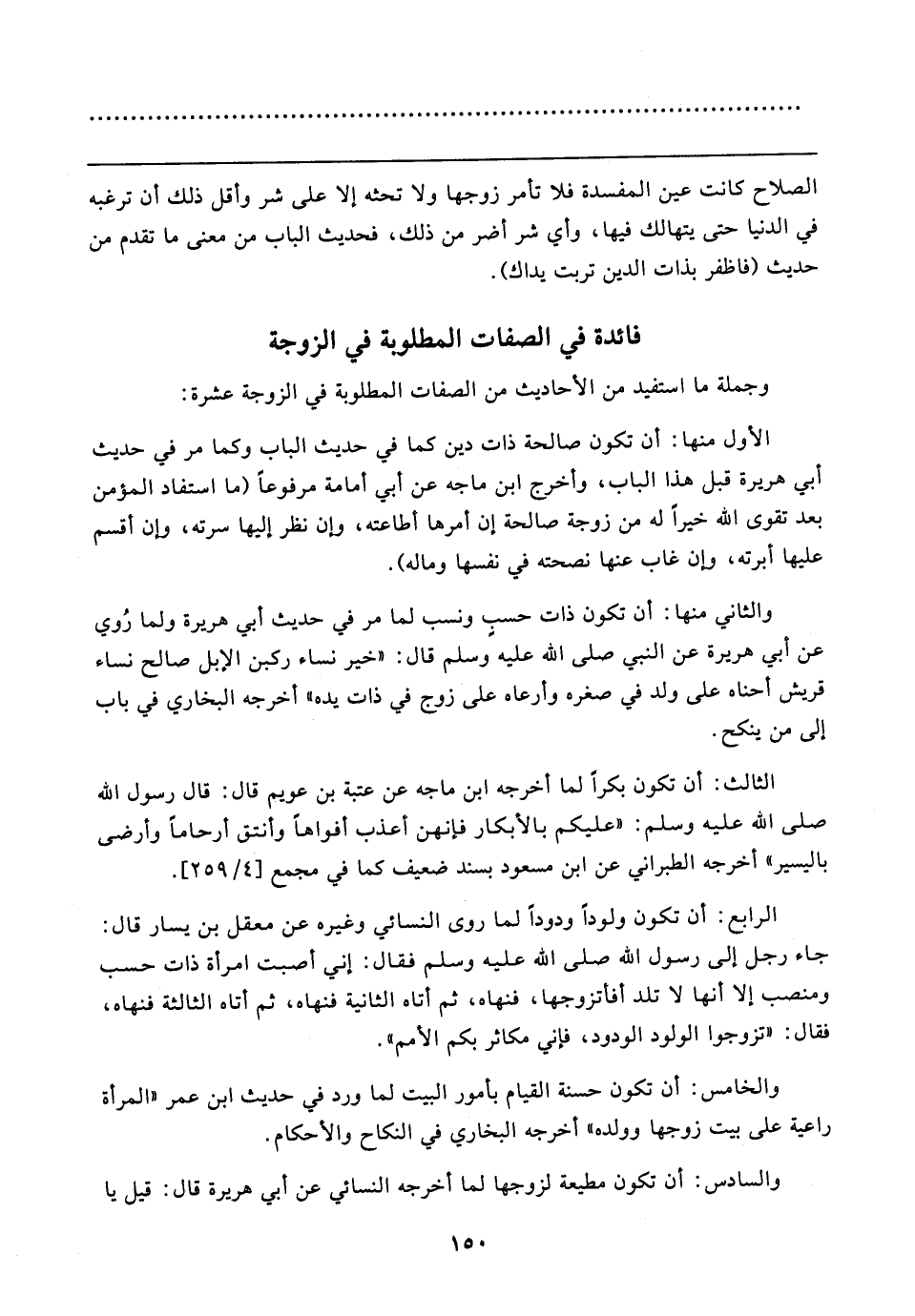 الأول منها: أن تكون صالحة ذات دين كما في حديث الباب وكما مر في حديث أبي هريرة قبل هذا الباب، وأخرج ابن ماجه عن أبي أمامة مرفوعًا (ما استفاد المؤمن بعد تقوى الله خيرًا له من زوجة صالحة إن أمرها أطاعته، وإن نظر إليها سرته، وإن أقسم عليها أبرته، وإن غاب عنها نصحته في نفسها وماله).
