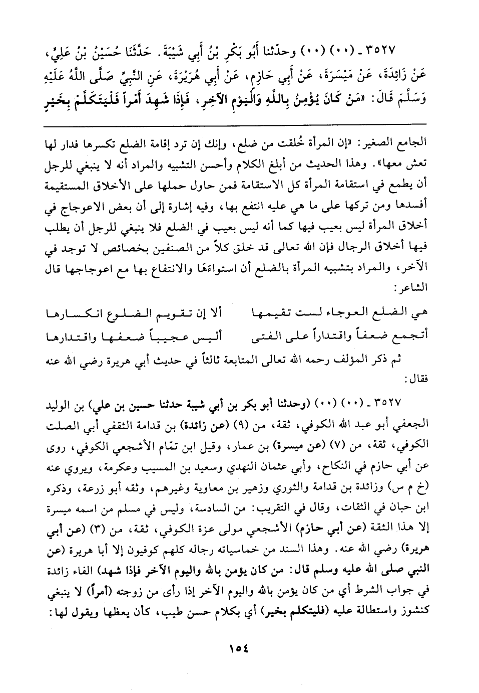 ٣٥٢٧ - (٠٠) (٠٠) (وحدثنا أبو بكر بن أبي شيبة حدثنا حسين بن علي) بن الوليد الجعفي أبو عبد الله الكوفي، ثقة، من (٩) (عن زائدة) بن قدامة الثقفي أبي الصلت الكوفي، ثقة، من (٧) (عن مبسرة) بن عمار، وقيل ابن تمام الأشجعي الكوفي، روى عن أبي حازم في النكاح، وأبي عثمان النهدي وسعيد بن المسيب وعكرمة، ويروي عنه (خ م س) وزائدة بن قدامة والثوري وزهير بن معاوية وغيرهم، وثقه أبو زرعة، وذكره ابن حبان في الثقات، وقال في التقريب: من السادسة، وليس في مسلم من اسمه ميسرة إلا هذا الثقة (عن أبي حازم) الأشجعي مولى عزة الكوفي، ثقة، من (٣) (عن أبي هريرة) رضي الله عنه. وهذا السند من خماسياته رجاله كلهم كوفيون إلا أبا هريرة (عن النبي صلى الله عليه وسلم قال: من كان يومن بالله واليوم الآخر فإذا شهد) الفاء زائدة في جواب الشرط أي من كان يؤمن بالله واليوم الآخر إذا رأى من زوجته (أمرًا) لا ينبغي كنشوز واستطالة عليه (فليتكلم بخير) أي بكلام حسن طيب، كأن يعظها ويقول لها: