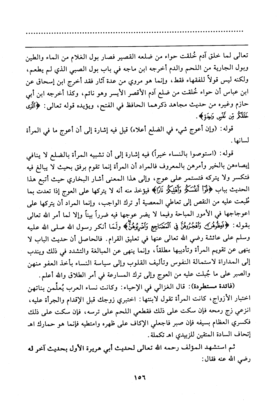 قوله: (استوصوا بالنساء خيرًا) فيه إشارة إلى أن تشبيه المرأة بالضلع لا ينافي إيصاءهن بالخير وأمرهن بالمعروف فالمراد أن المرأة إنما تقوم برفق بحيث لا يبالغ فيه فتكسر ولا يتركه فتستمر على عوج، وإلى هذا المعنى أشار البخاري حيث أتبع هذا الحديث بباب {قُوا أَنْفُسَكُمْ وَأَهْلِيكُمْ نَارًا} فيؤخذ منه أنه لا يتركها على العوج إذا تعدت بما طُبعت عليه من النقص إلى تعاطي المعصية أو ترك الواجب، وإنما المراد أن يتركها على اعوجاجها في الأمور المباحة وفيما لا يضر عوجها فيه ضررًا بينًا وإلا لما أمر الله تعالى بقوله: {فَعِظُوهُنَّ وَاهْجُرُوهُنَّ فِي الْمَضَاجِعِ وَاضْرِبُوهُنَّ} ولَمَا أنكر رسول الله صلى الله عليه وسلم على عائشة رضي الله تعالى عنها في تعليق القرام. فالحاصل أن حديث الباب لا ينهى عن تقويم المرأة وتأديبها مطلقًا، وإنما ينهى عن المبالغة والتشدد في ذلك ويندب إلى المداراة لاستمالة النفوس وتأليف القلوب إلى سياسة النساء بأخذ العفو منهن والصبر على ما جُبلت عليه من العوج وإلى ترك المسارعة في أمر الطلاق والله أعلم.